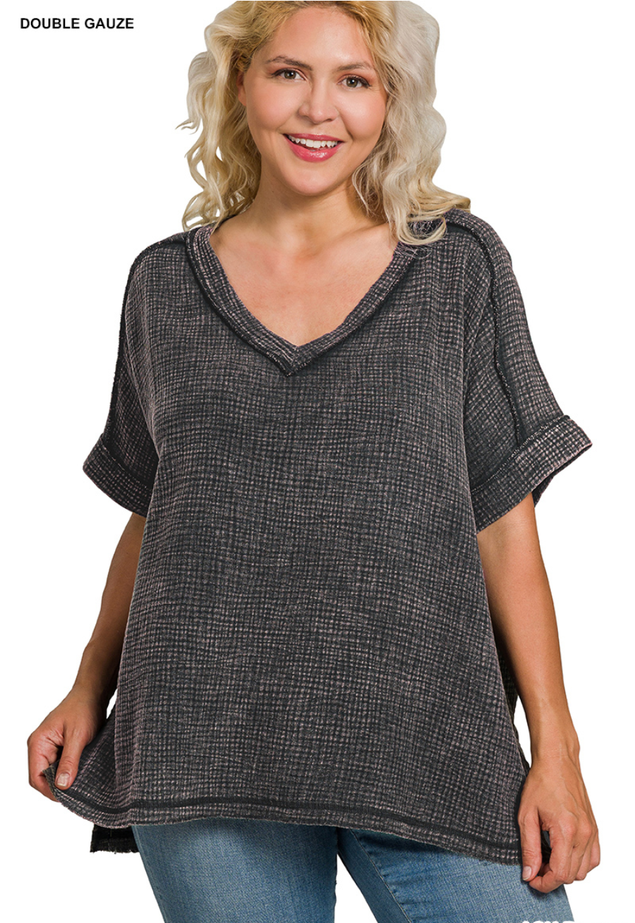 PLUS ACID WASHED DOUBLE GAUZE V-NECK CUFFED SHORT-SLEEVE TEE