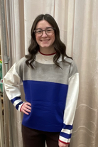 This Colorblock Mock Neck Sweater is a relaxed, colorblocked knit with bold blue and neutral panels and striped sleeve cuffs. The mock neck gives a slightly elevated silhouette while keeping the cozy feel of a pullover. It's designed by ee:some and works well for casual weekends or layered office looks.