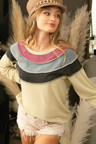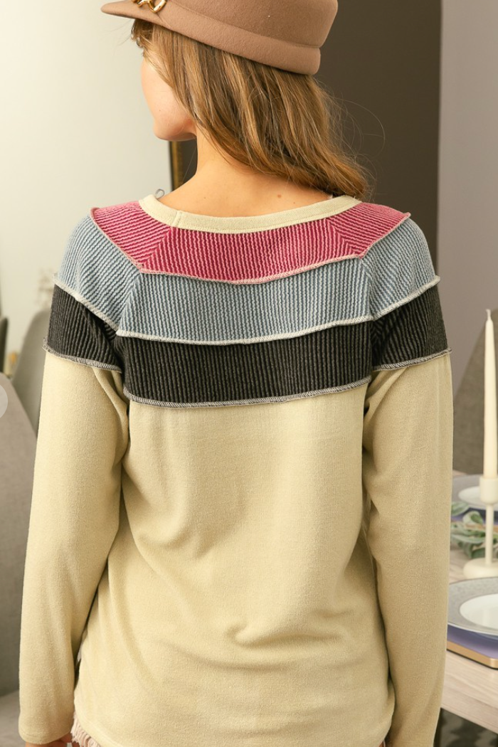 A relaxed long-sleeve sweater with a layered, colorblock ruffle yoke that adds playful texture to your wardrobe. The Colorblock Ruffle Yoke Sweater is knit from a soft sweater fabric and falls in a casual, easy silhouette. Lightweight yet cozy, it pairs equally well with denim or laid-back shorts for an off-duty look. Subtle ribbed detailing on the yoke gives the piece a handcrafted, boho-inspired touch.