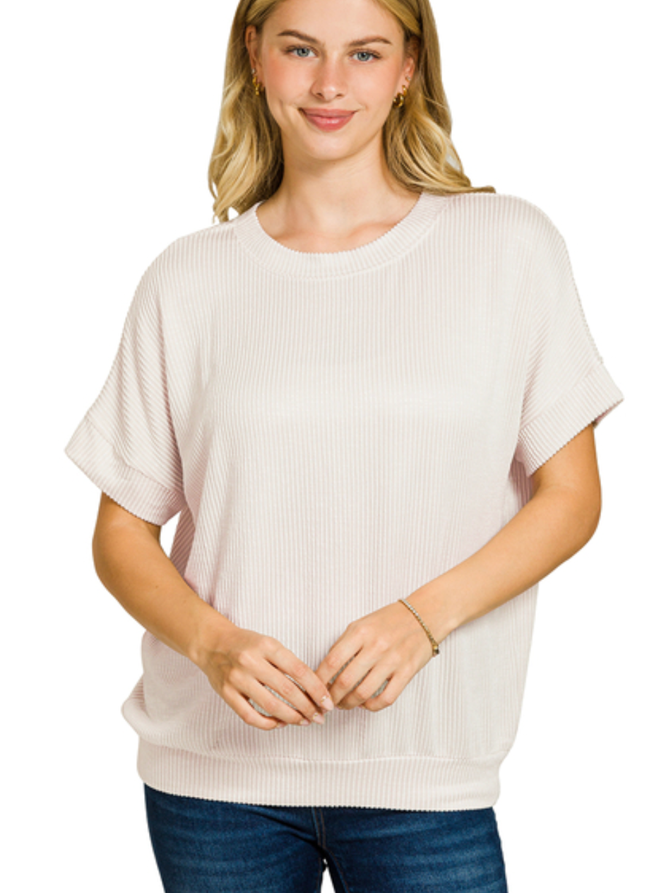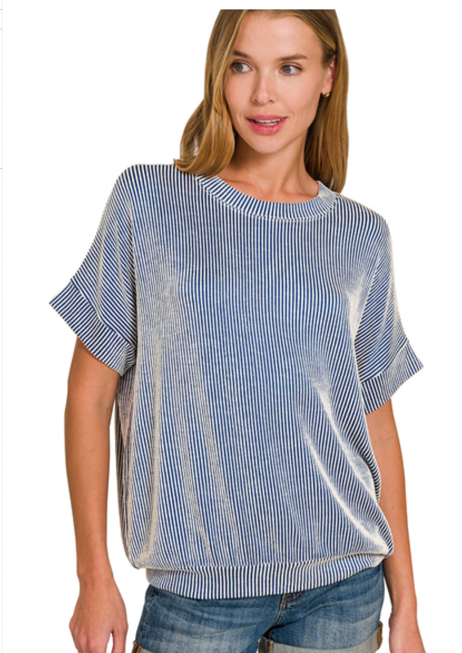 A relaxed, striped knit tee with a subtle corded texture and a roomy silhouette. The Corded Tee features a crew neckline and cuffed short sleeves for an easy, everyday look. Zenana crafted this top in a soft, lightweight fabric that drapes casually over jeans or shorts. Wear it for laid-back weekends or running errands when comfort is key.