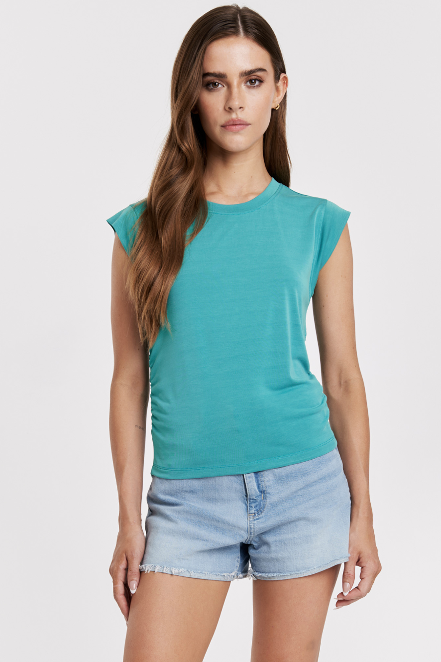 The Alora side shirred muscle tee is a must-have that seamlessly blends style and comfort. Crafted with a modern twist on the classic muscle tee, this piece features chic side shirring that adds a flattering, feminine touch. The versatile design makes it perfect for any occasion, whether you're dressing it up for a night out or keeping it casual for a day of errands.