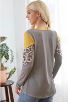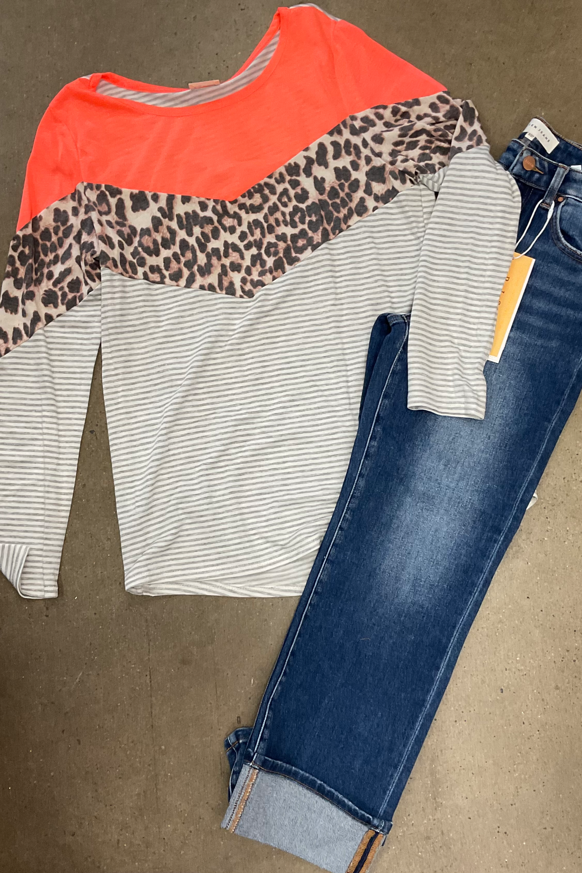 A relaxed long-sleeve colorblock top with a playful mix of bright turquoise, leopard print, and soft gray stripes. The Melina Chevy Colorblock Top from Lovely Melody features a scoop neckline and a loose, tunic-like silhouette for easy layering. Soft, lightweight knit fabric keeps the look casual and comfortable for everyday wear. Pair it with jeans or leggings for a laid-back weekend outfit.