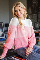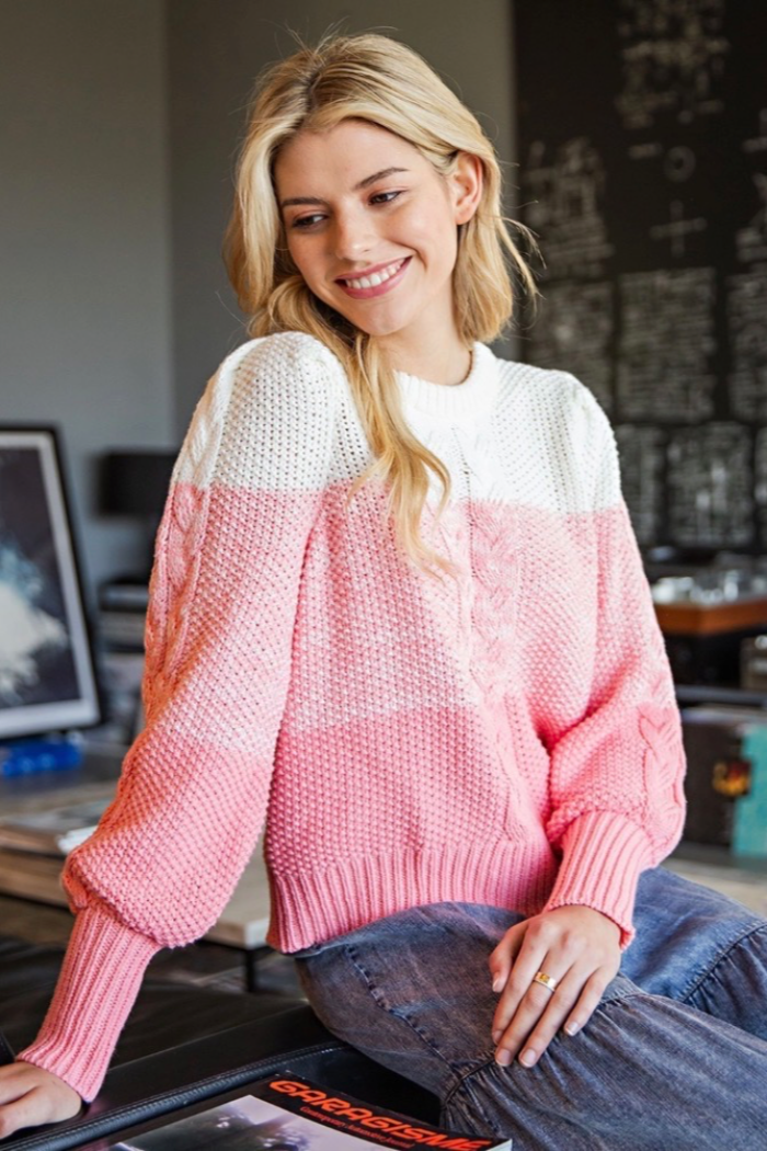 A cozy ombré cable knit sweater in soft pink-to-white colorblocking with chunky ribbed cuffs and a classic crew neckline. The relaxed silhouette and textured cable details give it a laid-back, homespun feel perfect for layering. This Ombré Cable Knit Sweater is crafted for casual comfort and easy styling. The piece is offered by ee:some and pairs naturally with jeans or lounge bottoms for a cozy-at-home vibe.