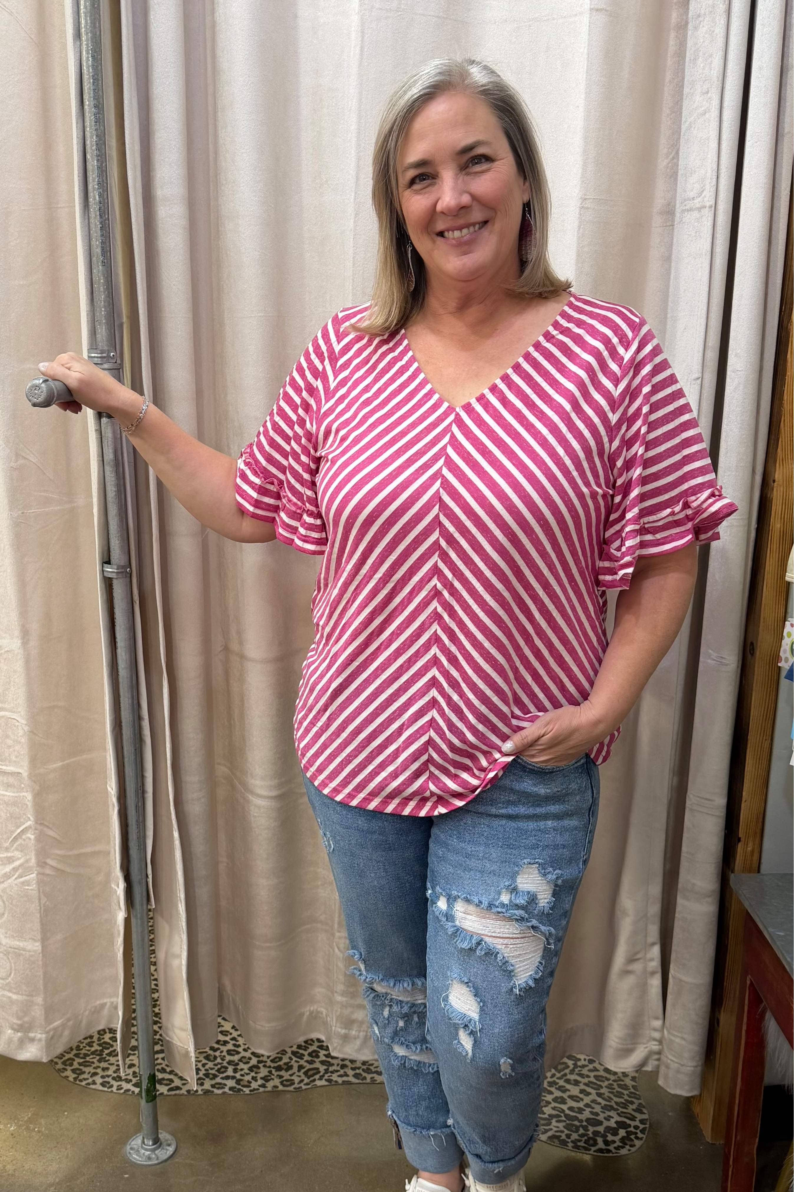 A relaxed stripe knit top with feminine ruffled short sleeves and a flattering V-neckline. The Stripe Knit Top with Ruffled Sleeve from Bibi is made in a soft, lightweight knit with diagonal stripes that create a slimming chevron effect. It has a breezy, casual silhouette ideal for everyday wear or weekend outings. Pair it with denim or tailored trousers for an easy, polished look.