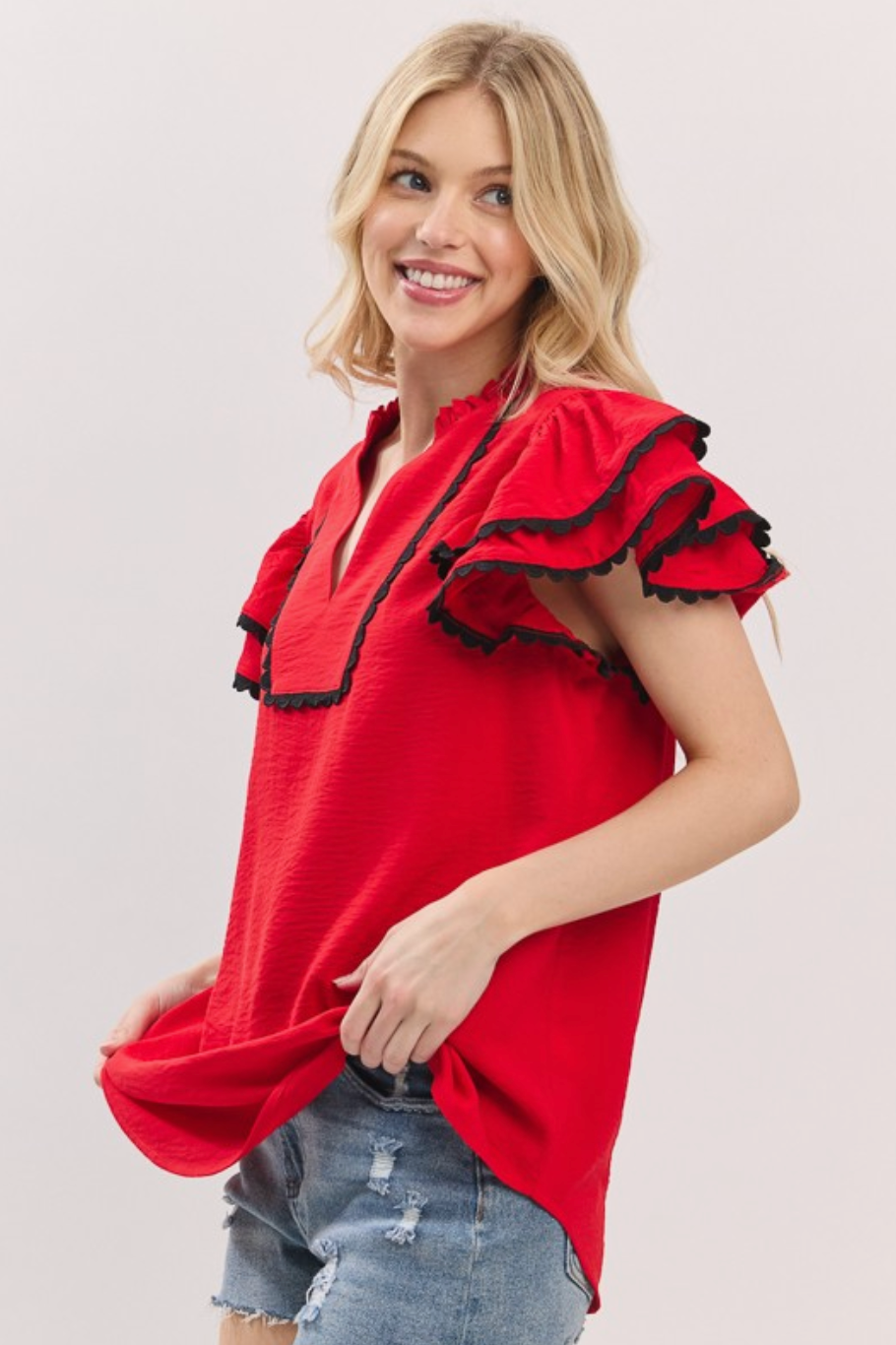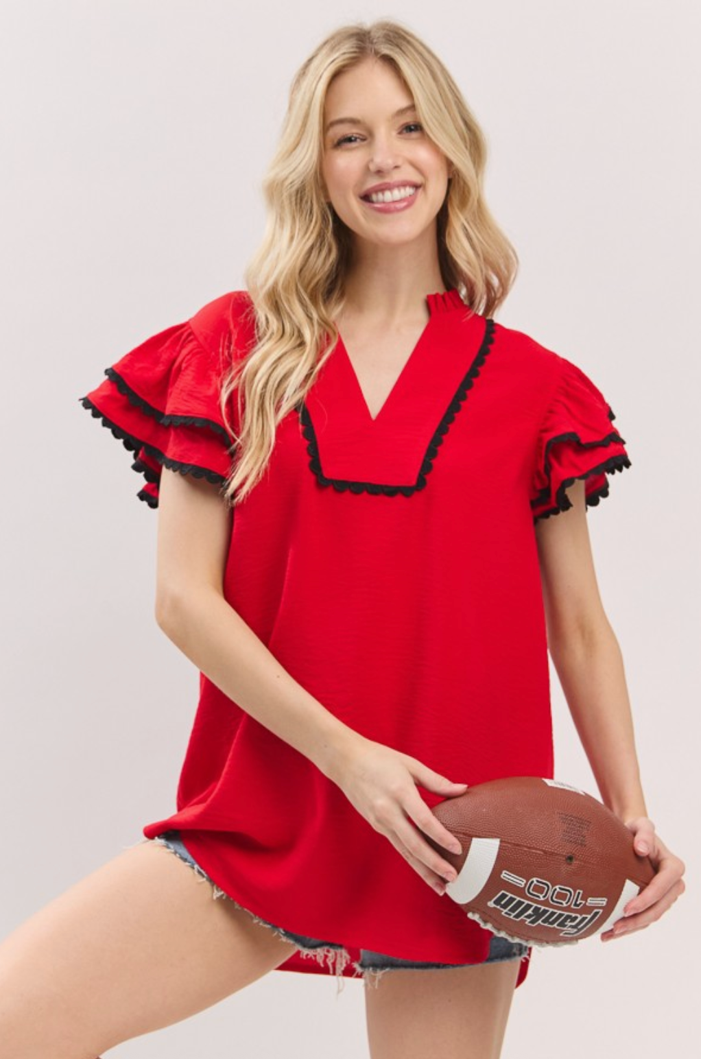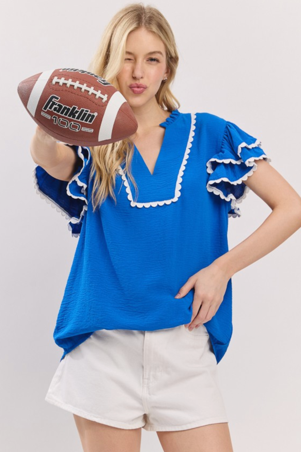 This playful and feminine top is a perfect choice for your next game day look. Featuring bold double-layered ruffle sleeves with contrast scallop trim and a flattering V-neckline, this relaxed-fit blouse adds a fun twist to team spirit style. Pair it with your favorite denim or shorts for an effortless outfit that keeps you comfortable and cute all day.