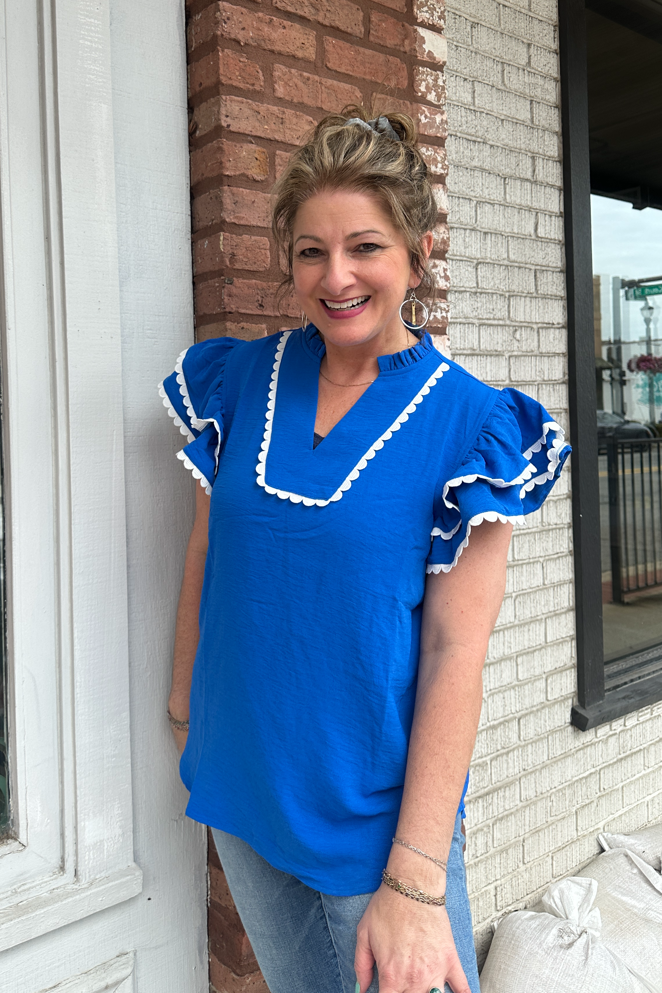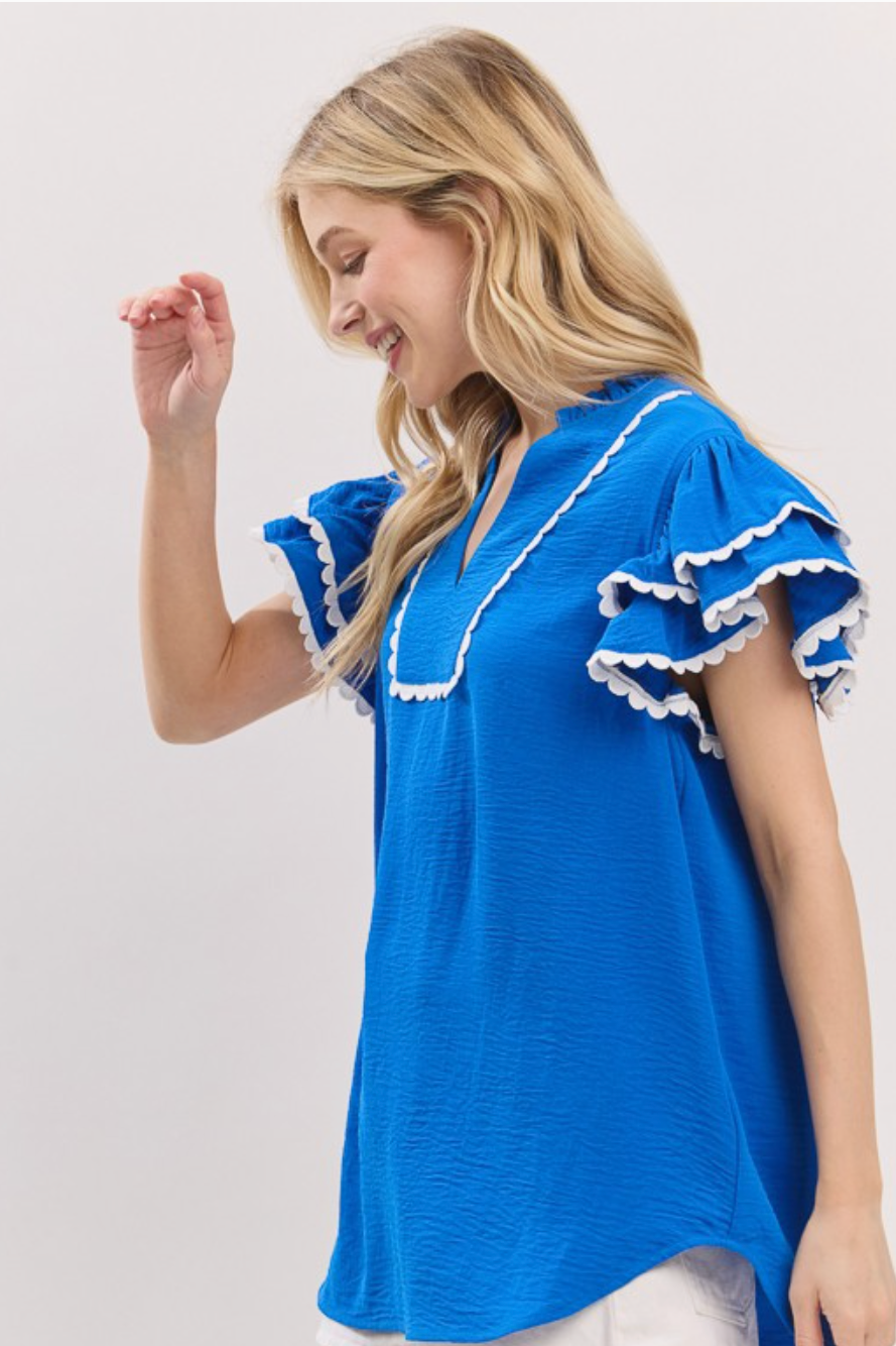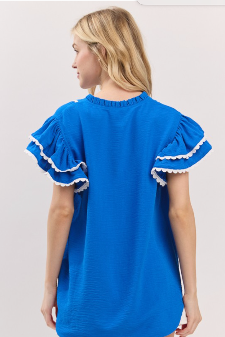 This playful and feminine top is a perfect choice for your next game day look. Featuring bold double-layered ruffle sleeves with contrast scallop trim and a flattering V-neckline, this relaxed-fit blouse adds a fun twist to team spirit style. Pair it with your favorite denim or shorts for an effortless outfit that keeps you comfortable and cute all day.