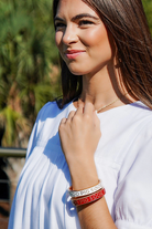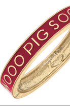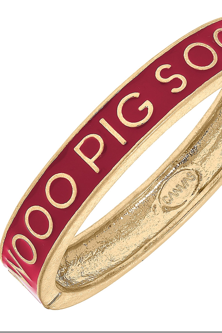 Add a splash of team spirit to your game day outfit with the Arkansas Razorbacks Enamel Hinge Bangle. It features an enamel material with worn gold plating and the Arkansas Razorbacks hog call “Wooo Pig Sooie” embossed around the bangle. Wear one, or build a stack with our other enamel bangle styles or Enamel Claudia bangle