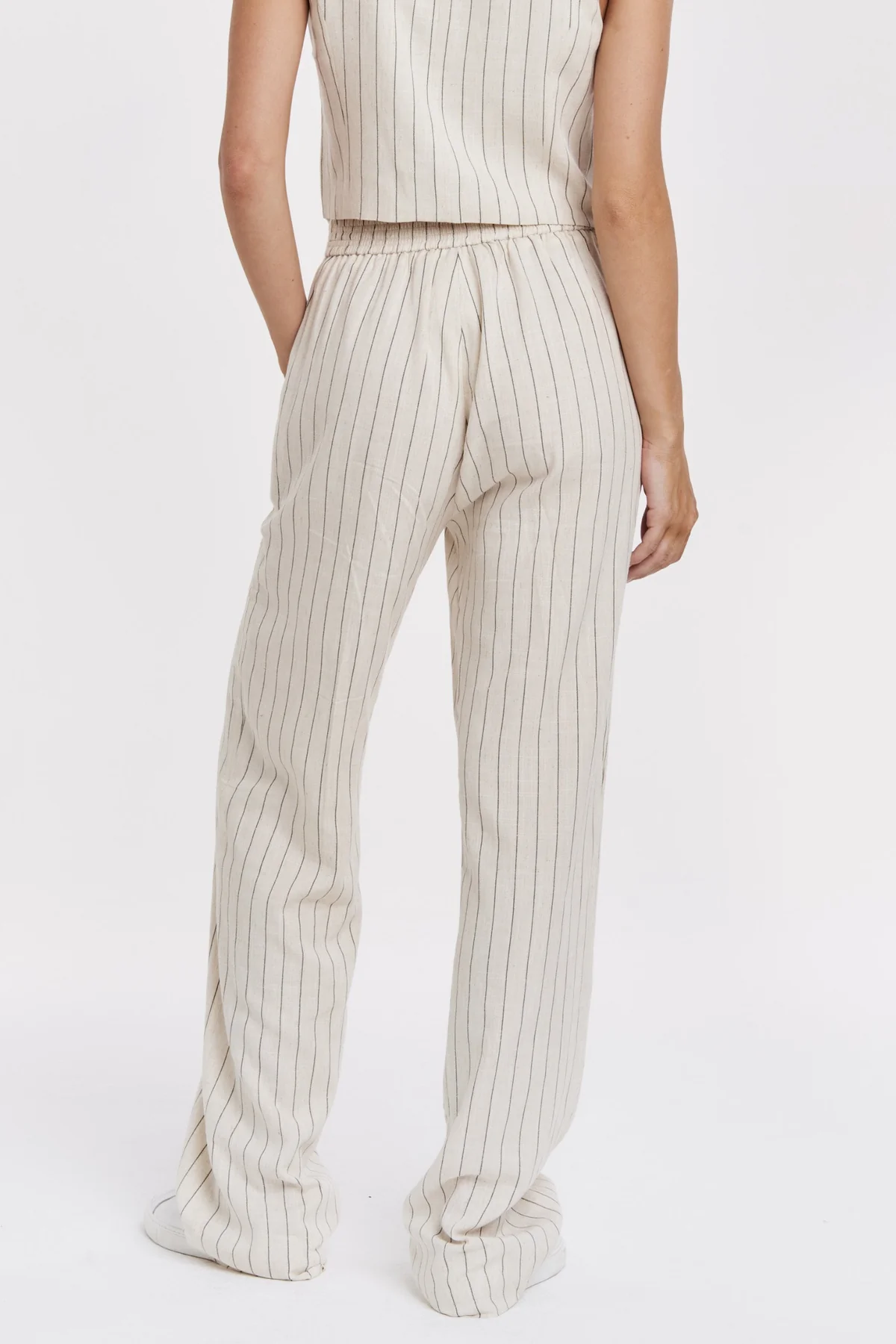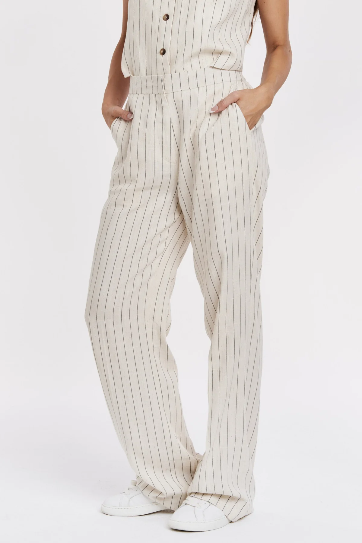 Azula stripe linen pants embracing timeless elegance that blends style with unparalleled comfort. Crafted for versatility with slant pocket, these pants offer an airy fit and drape beautifully, making them an ideal choice for both laid-back weekends and morning commutes. With a sophisticated cream and black stripe design, perfect for a variety of occasions, ensuring you stay chic and relaxed throughout the day. The breathable linen-viscose blend fabric promises a cool, comfortable wear, making these pants a must-have.