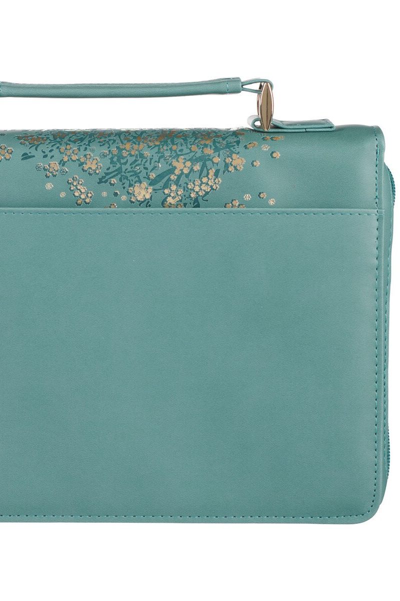The teal faux leather Bible cover features a charming heat-debossed tree design that stretches across both covers and the spine, trimmed with gold-foiled blossoms. A heat-debossed bird taking flight from one of its branches naturally guides your eyes toward the elegantly heat-debossed title.