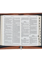 Two elastic loops, designed to hold pens and highlighters, are secured inside the Bible case. Additionally, the spine is fitted with two ribbon markers for marking pages, a red one for the New Testament and a black ribbon for the Old Testament.