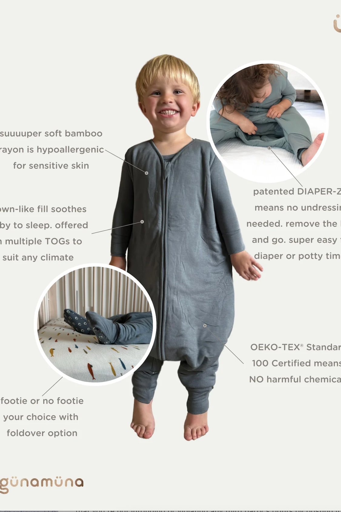 Watch them sleep in it. Watch them walk in it. Watch them get undressed for potty or diaper changes without getting undressed at all. Our new genius footie sleep bag features our signature DIAPER-ZiP® and a separate leg design with convertible foot cuffs that flip open or closed. The anti-slip grips mean no slips or slides, just smooth moves. And of course, we’ve combined E-Z diaper changes with yummy comfort. Cuz we do that.