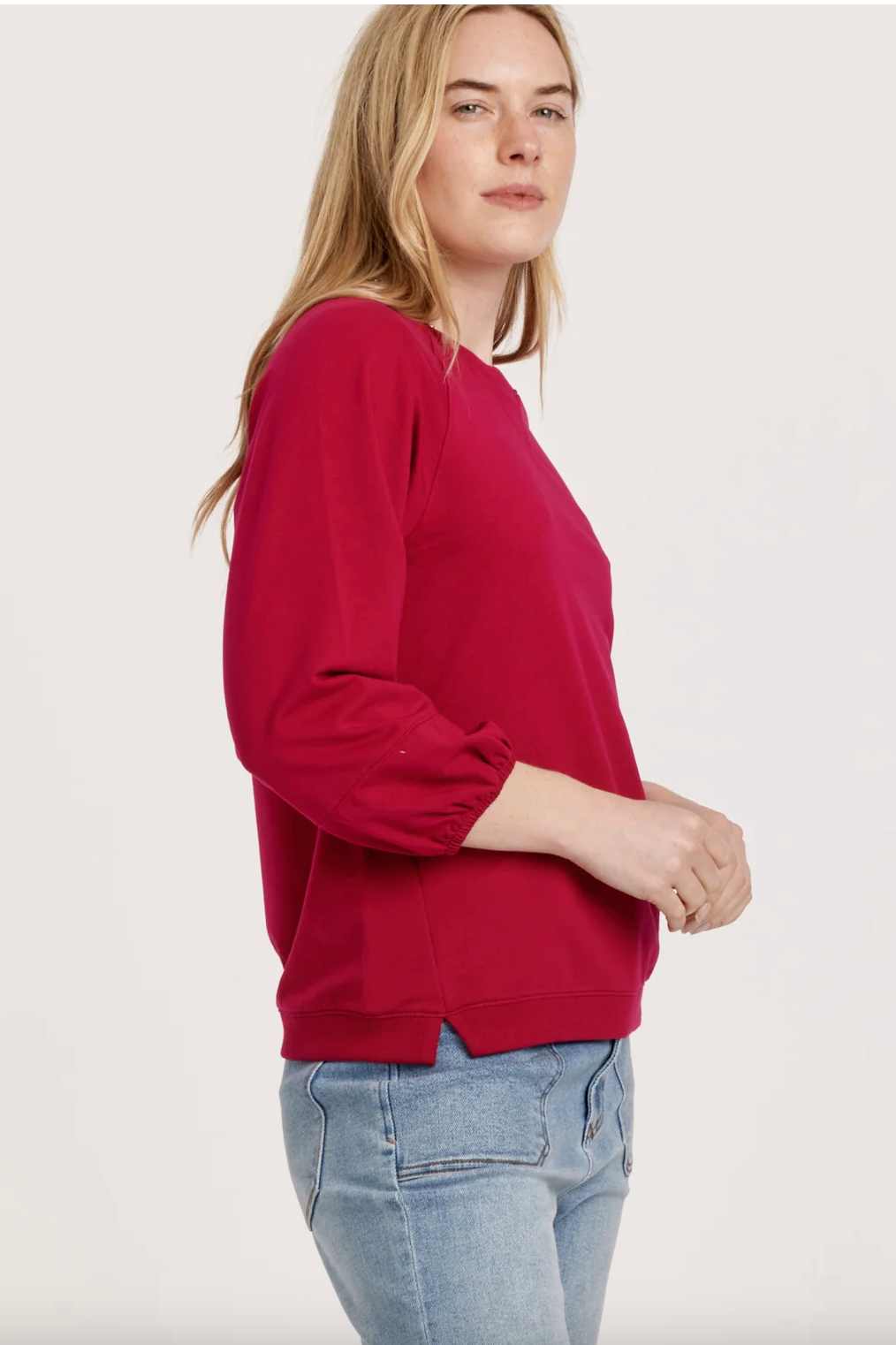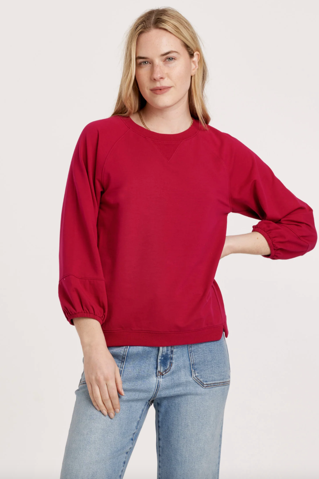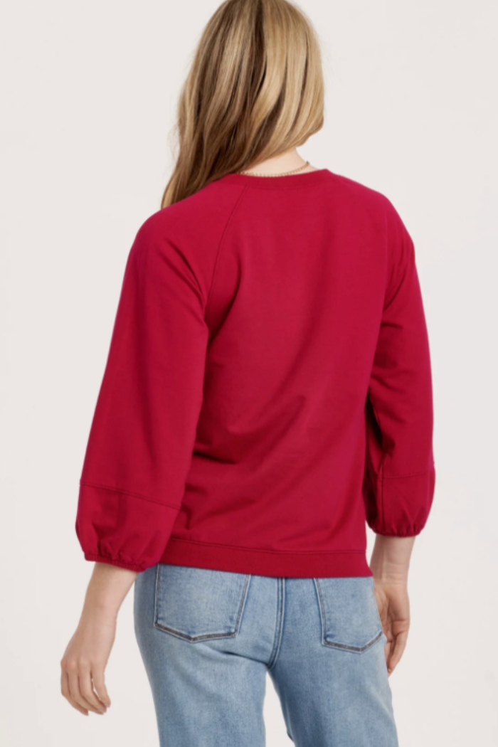 Raglan bell long sleeve sweatshirt with elastic cuffs, crew neck with rib "V" insert, waistband finished with side slits. Casual wear for all you do... timeless go-to staple! Solid color knit on relaxed fit.
