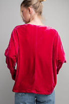 Long sleeve velvet blouse top featuring a loose fit and comfortable body, a v-neckline, relaxed sleeves and a finished bottom hem.