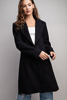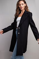 Long sleeve midi trench coat featuring a lapel collar, a two button down front, two side hip pockets and is lined.