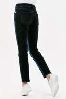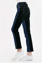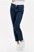 High rise ankle slim straight leg jeans. It's the outstanding fit that sits slightly lower on the waist and fitted slender from the hip to mid thigh. Ankle inseam on comfort stretch denim accented with designer tonal color blocks of ever-reliable dark wash on top & flattering black back support, sewn with tonal stitching.