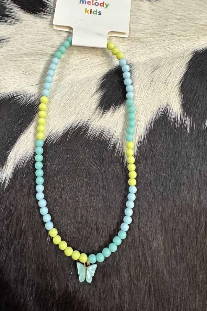 Beaded Stretch Necklace with fun blue and green beads and pretty blue butterfly