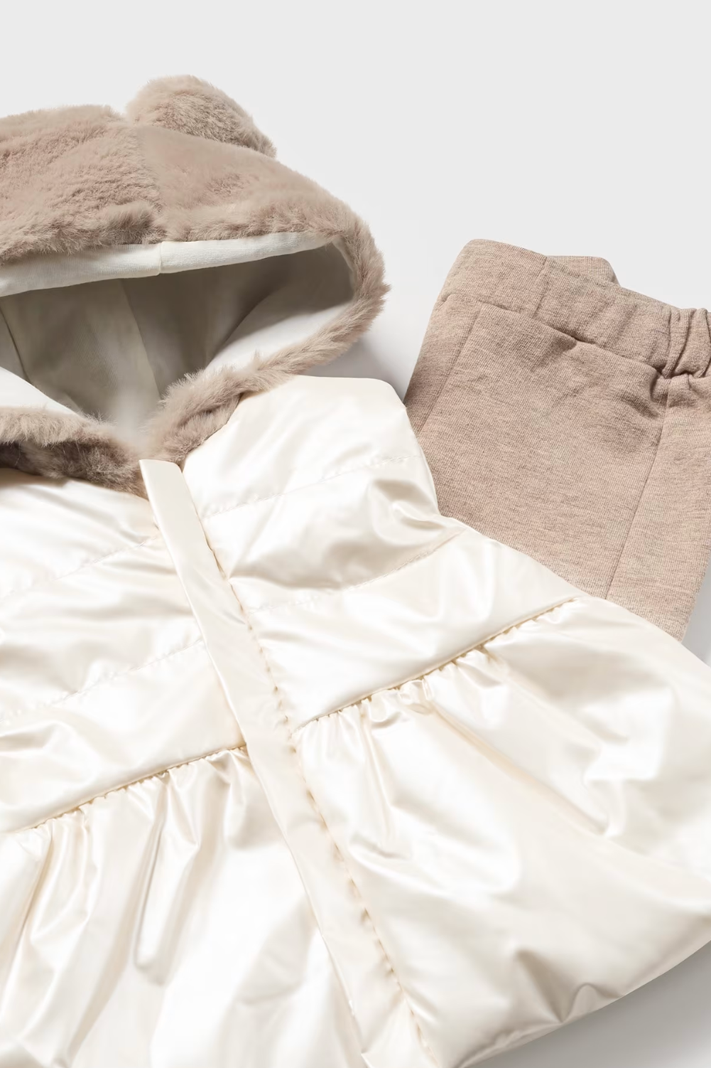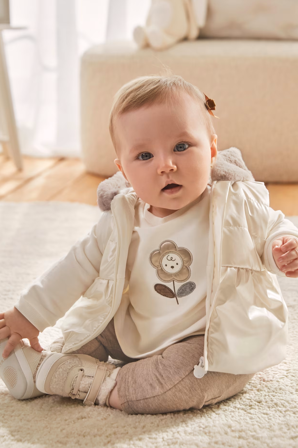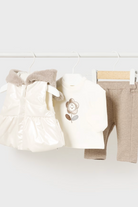 Champagne shimmer baby vest with teddy hood, long sleeve, snap back flower tee and light brown leggings