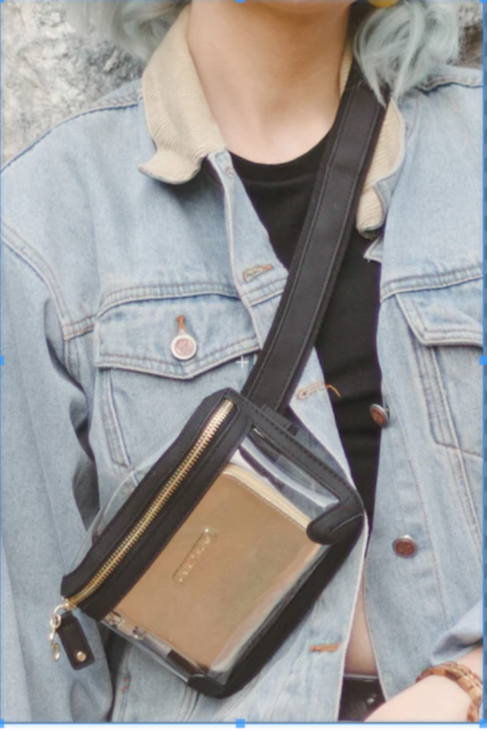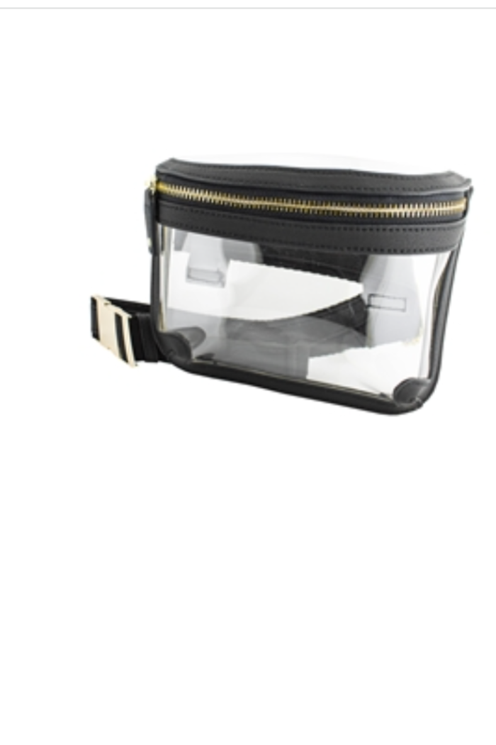 Go hands free with this trending Belt Bag design! The Belt Bag features a clear PVC body with gold hardware and PU Leather accents. The main zippered storage compartment is perfectly sized to fit your cell phone, cash and credit cards, lip gloss, keys, or any small essentials. Secure the belt bag easily around your waist with the cotton webbed and PU leather accented adjustable strap and metal side release buckle.