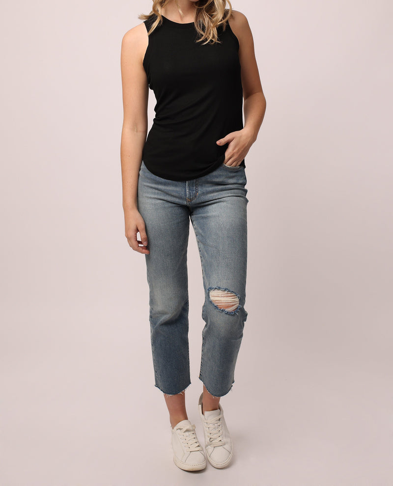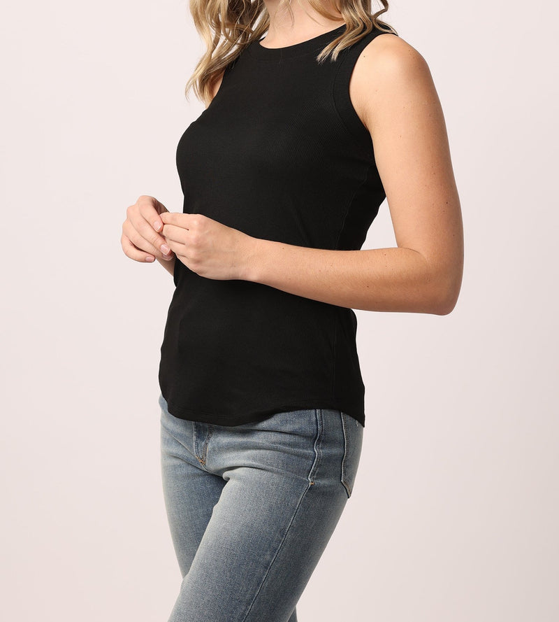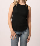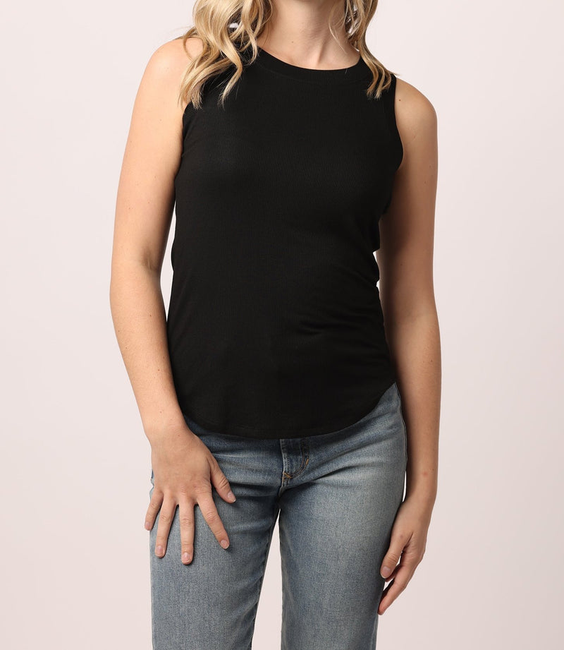 The Cleo ribbed tank features a stylish curved hem and is designed for a fitted, comfortable fit. This versatile tank top is perfect for layering or wearing on its own, making it an essential addition to any wardrobe. With its simple crew neck design and exceptional stretch, this tank meets everyday functionality while providing all-day comfort.