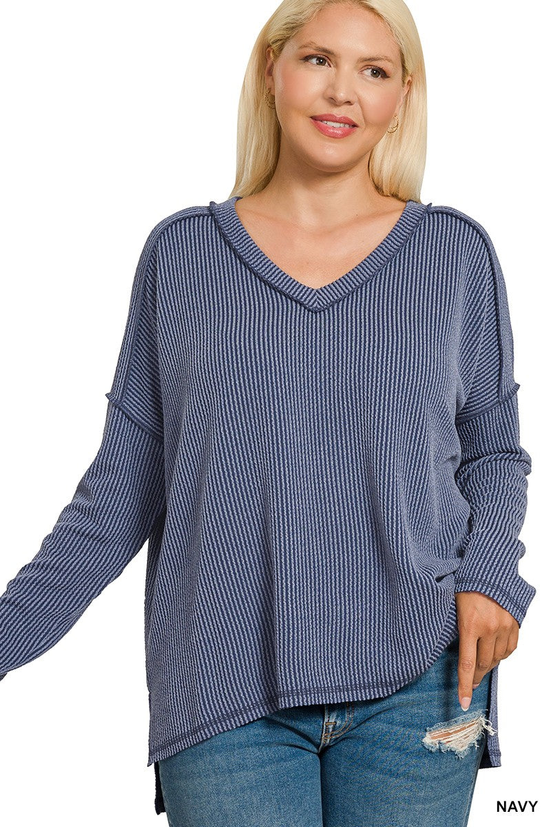 PLUS RAISED RIB LONG SLEEVE HI-LOW V NECK TOP
