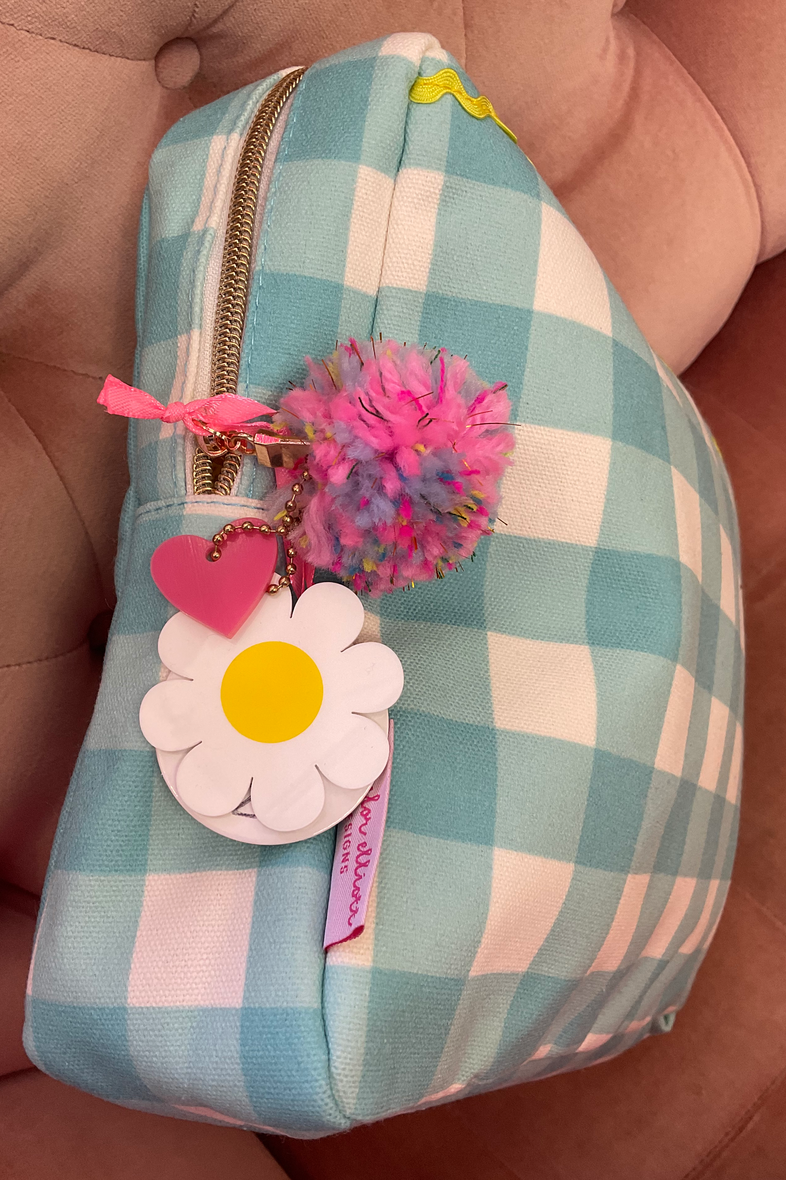 ♥ Colorful yarn + tinsel pom pom, acrylic pink heart, and acrylic daisy keychain included