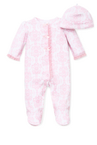 Your baby girl will love her damask print footie perfect for nap-time and playtime. Outfit details include lacy trim and a cute matching hat.