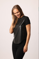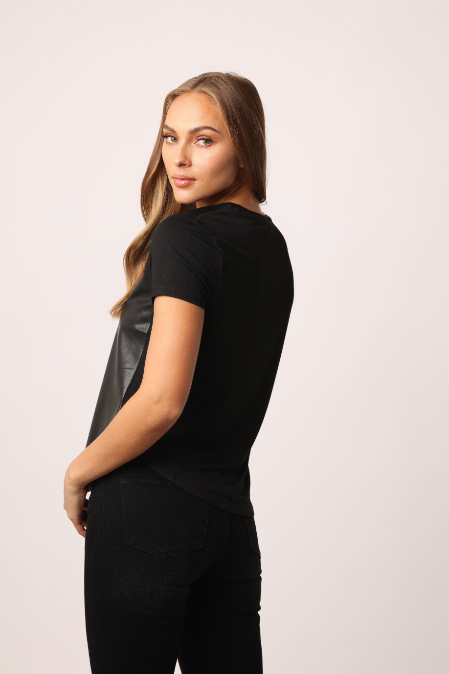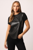 Short sleeve top with a pleated finished in vegan leather. Solid color pleather on standard fit. On trend leisure for any occasion... Let's rock!