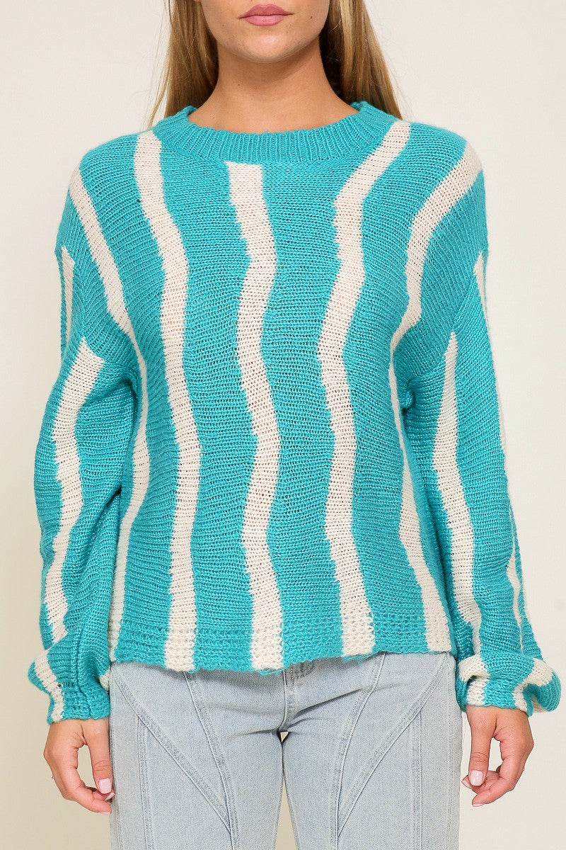 A cozy, graphic knit perfect for cold-weather layering, the Electric Wave Sweater brings a bright, wavy stripe to your winter wardrobe. The Timing Electric Wave Sweater features a crew neckline and a relaxed silhouette shown layered under a puffer for extra warmth. Soft, sweater-knit texture and long sleeves make it an easy pick for casual days or après activities on chilly afternoons.