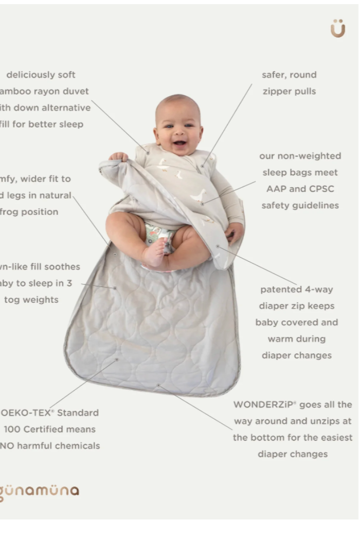 A better way to sleep. Cocoon baby into a cloud of comfort like a full-on-wrap-your-arm-around-me-twice koala hug with the günamüna® sleep bag duvet. This down alternative cozy wearable comforter, in silky soft bamboo rayon, with evenly distributed weight increases relaxation so baby feels secure & calm. Then enjoy the easy peasy WONDERZiP® diaper-zipper to keep baby covered during diaper changes.