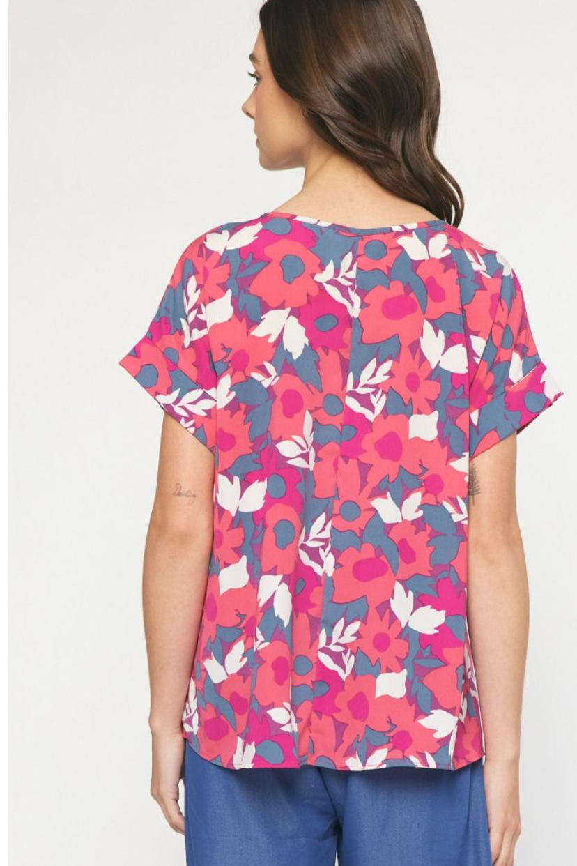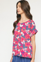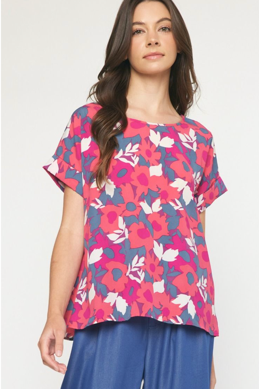 Floral print round neck short sleeve top featuring permanent rolled cuffs. Unlined. Knit. Non-sheer. Lightweight