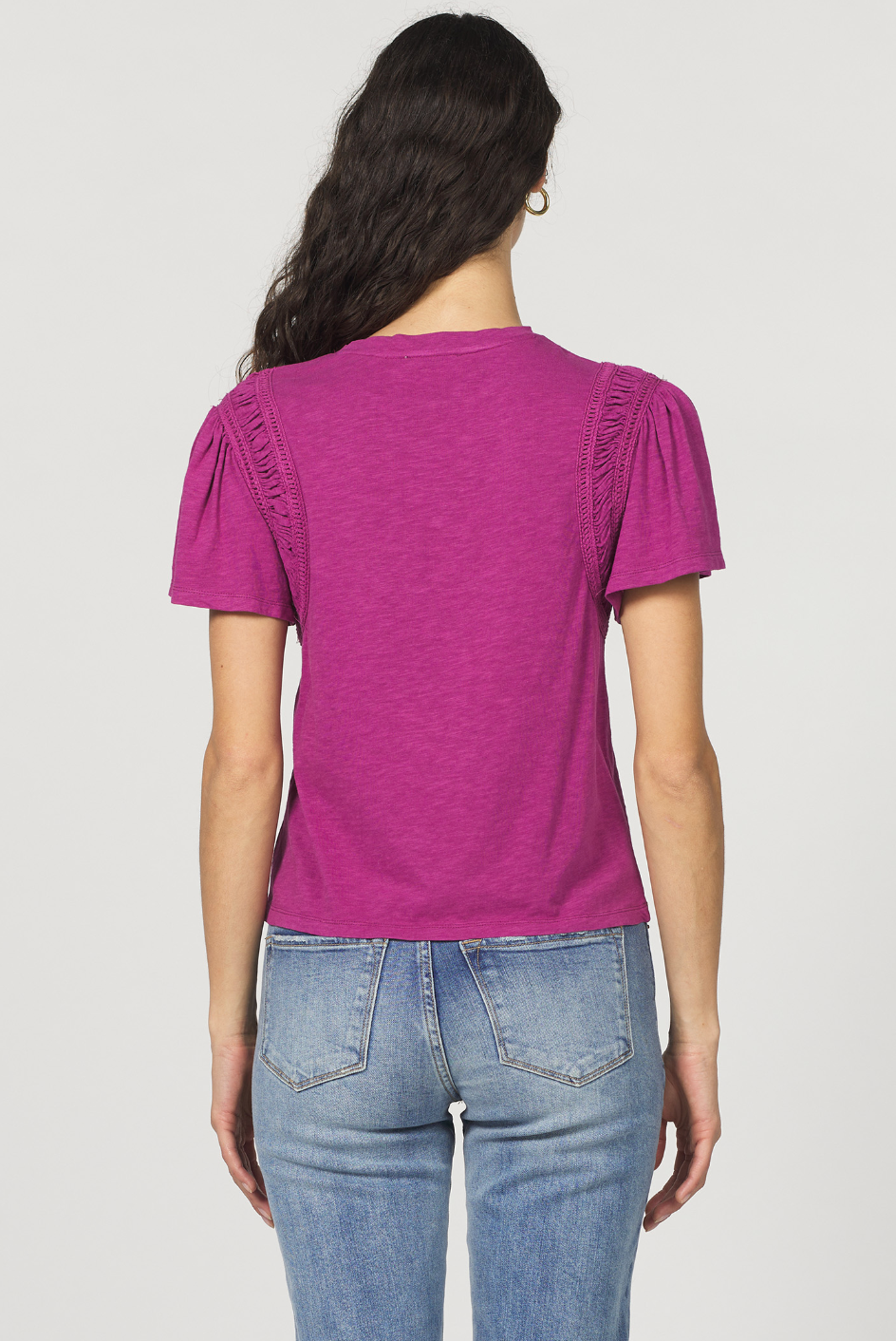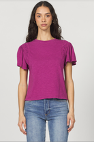 FLUTTER SLEEVE LACE TRIM TOP 60% COTTON, 40% RAYON