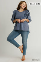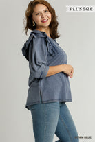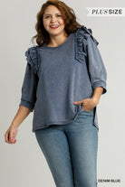 Boxy Cut Mineral Wash French Terry Top with Side Slit & Double Ruffle 3/4 Sleeves