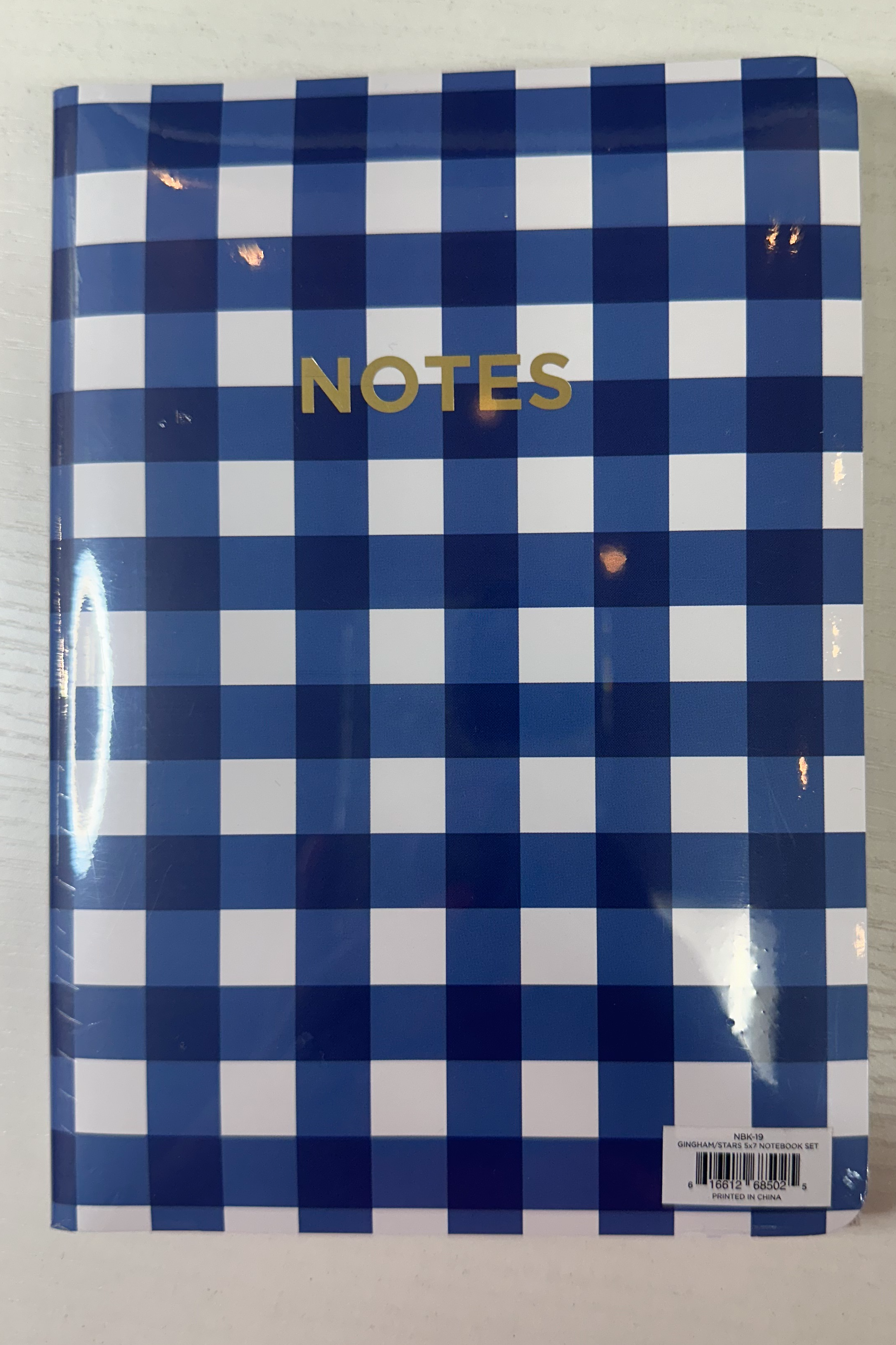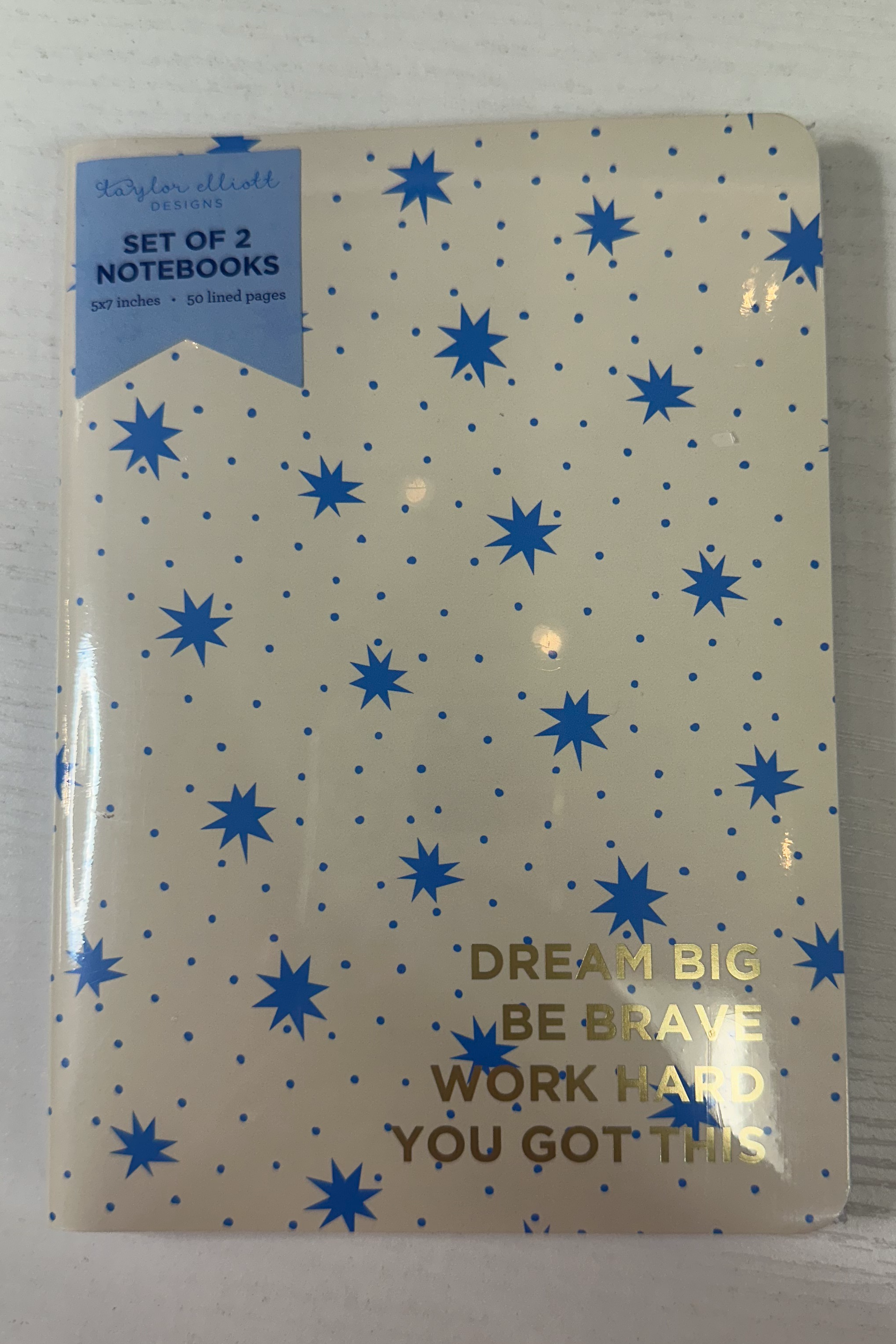 This set of 2 notebooks comes with one blue gingham notebook imprinted with Notes, and one star notebook imprinted with Dream Big, Be Brave, Work Hard, You Got This.