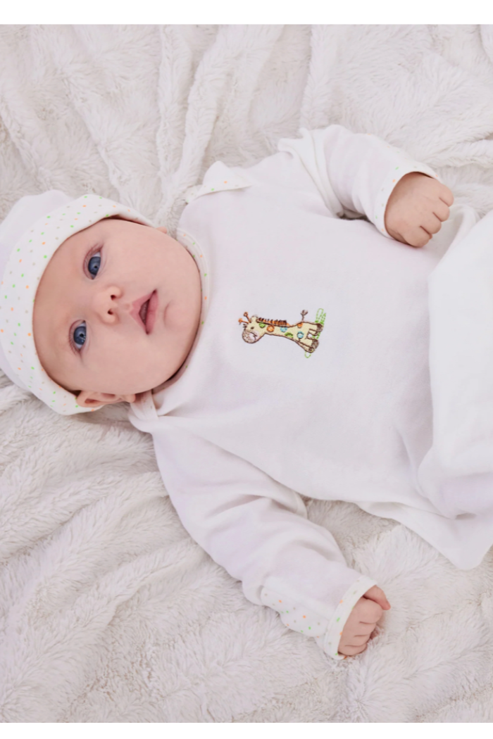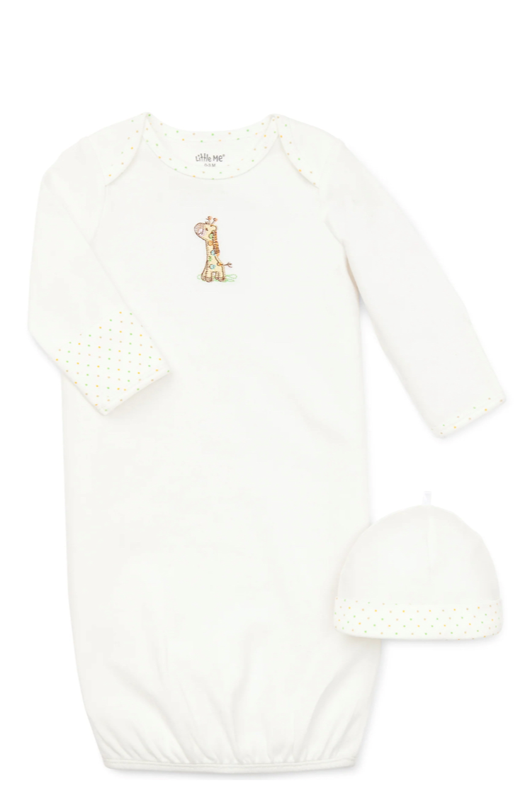 Your baby will be warm and comfortable in this soft, cotton gender neutral giraffe sleeper gown & hat set, with open, elasticized bottom for easy changing, and fold-over sleeve mittens.