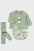 3 piece baby set with green goose seater, ruffle bloomers and knee high socks