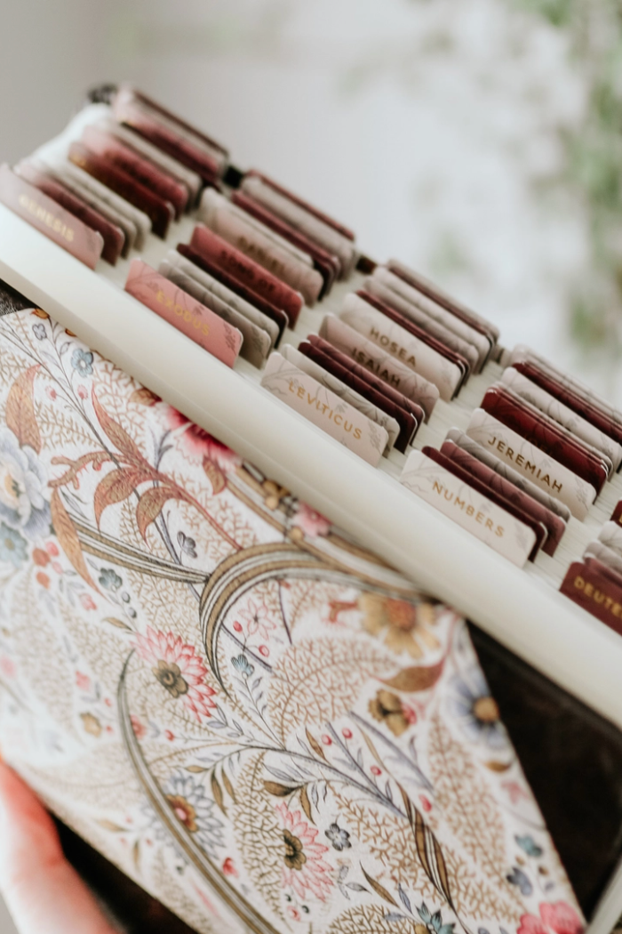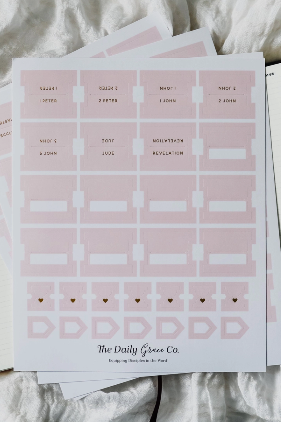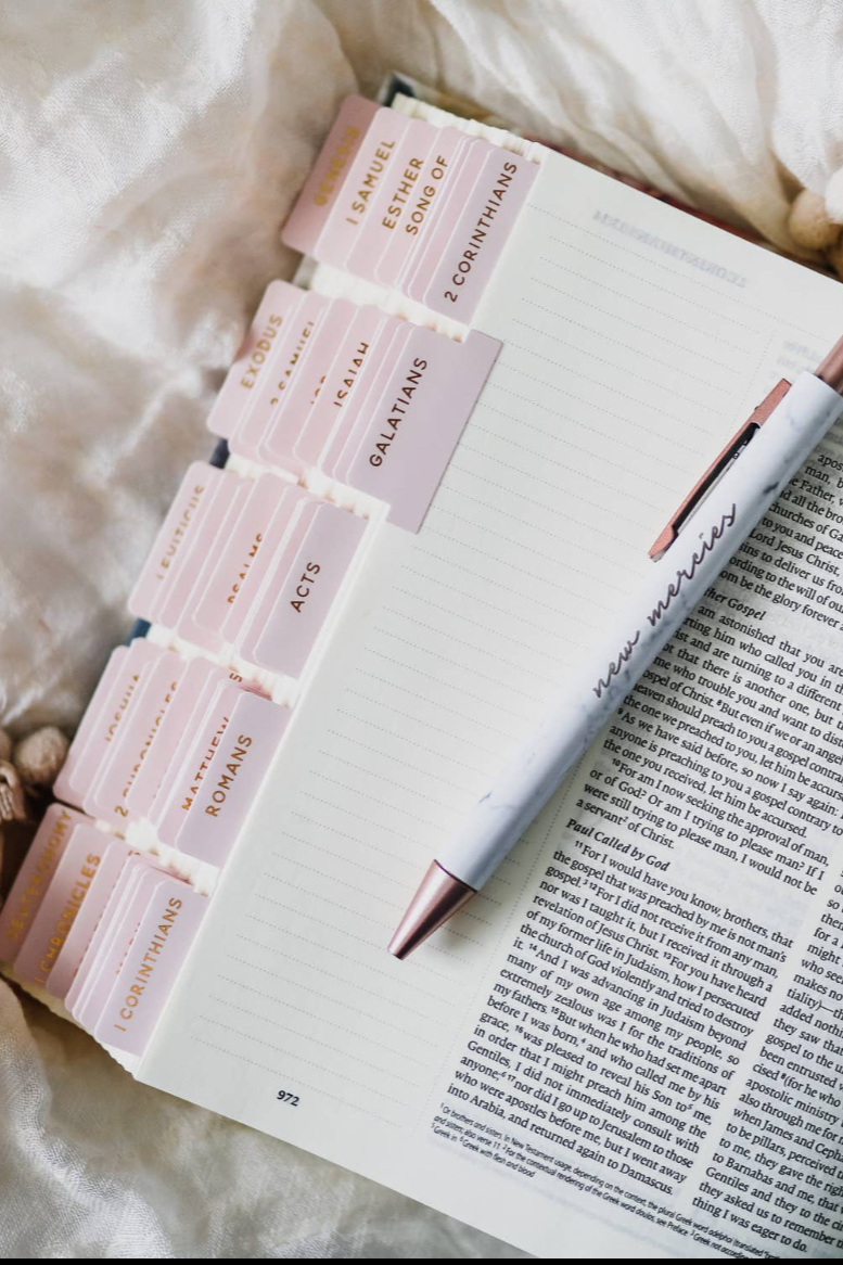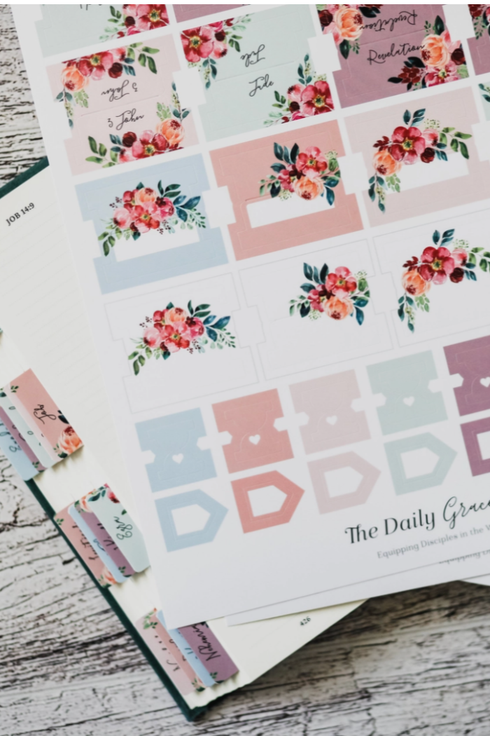 Flexible, matte coated sticker Bible tabs. Each set includes one double-sided tab for each book of the Bible as well as 23 additional sticker tabs.