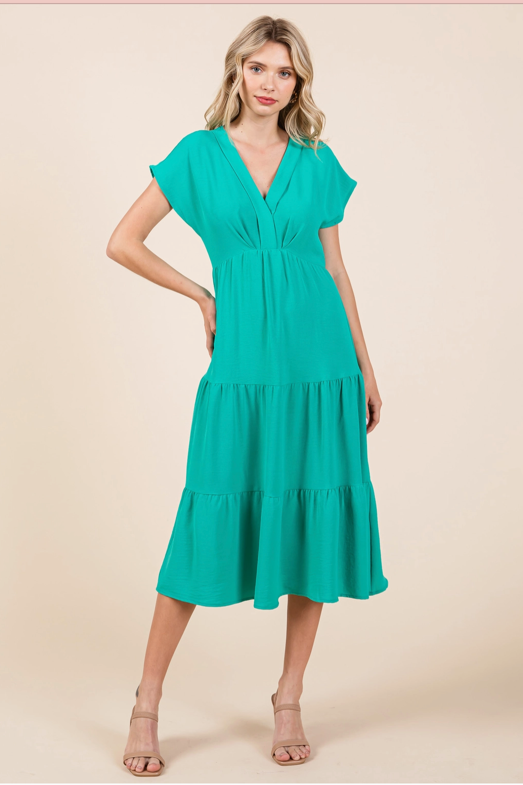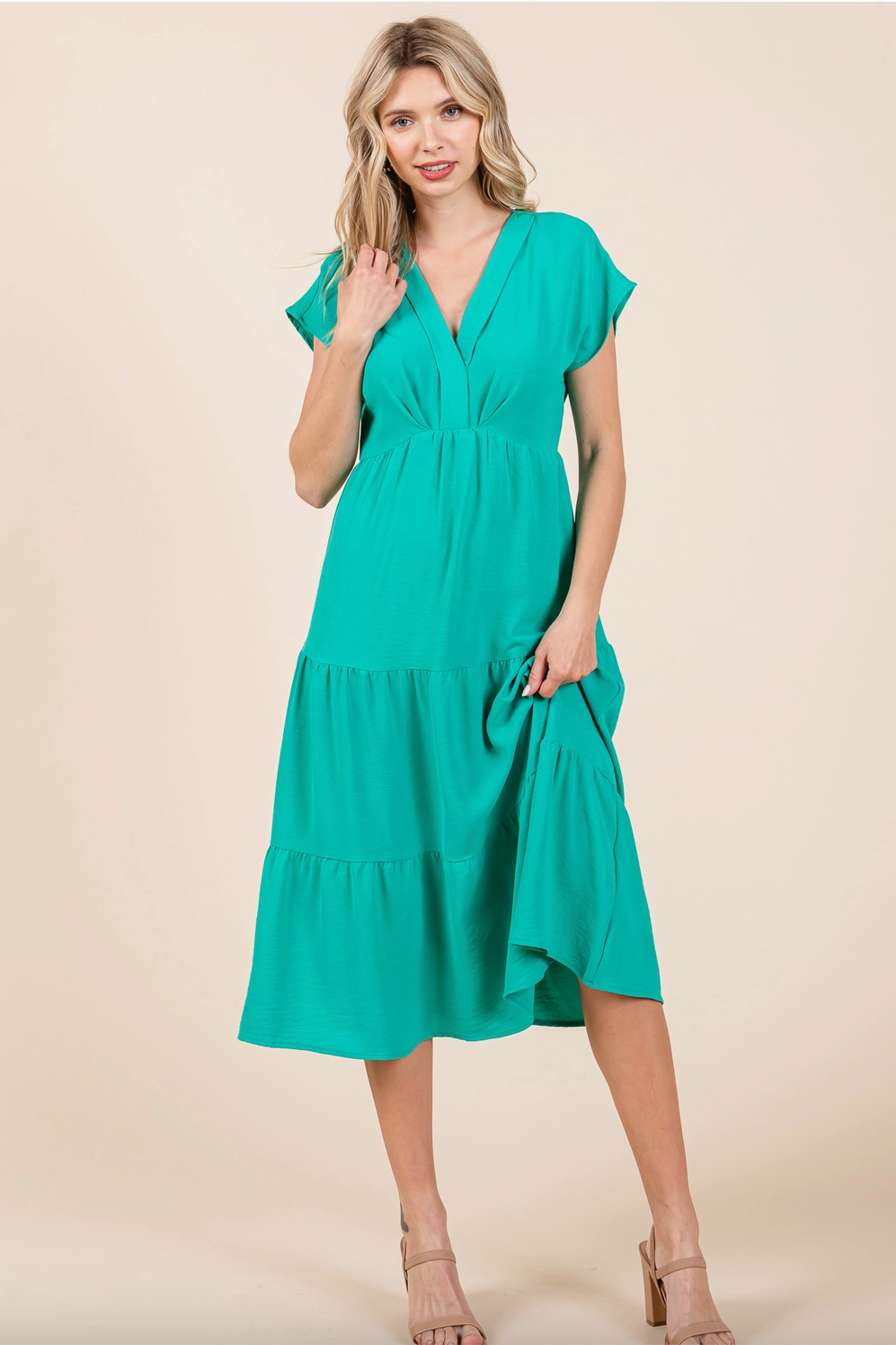 Green tiered dress with cap sleeves and v neck