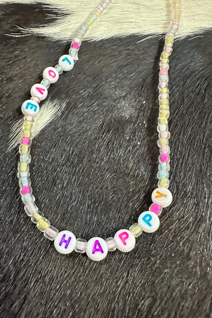 Girls Beaded Stretch Necklace with rainbow colors and LOVE, HAPPY letters