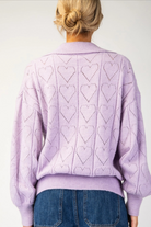 Heart pattern long sleeve sweater top featuring a collared V-neckline, a ribbed bottom band, ribbed cuffs and is a lightweight but soft fabrication.
