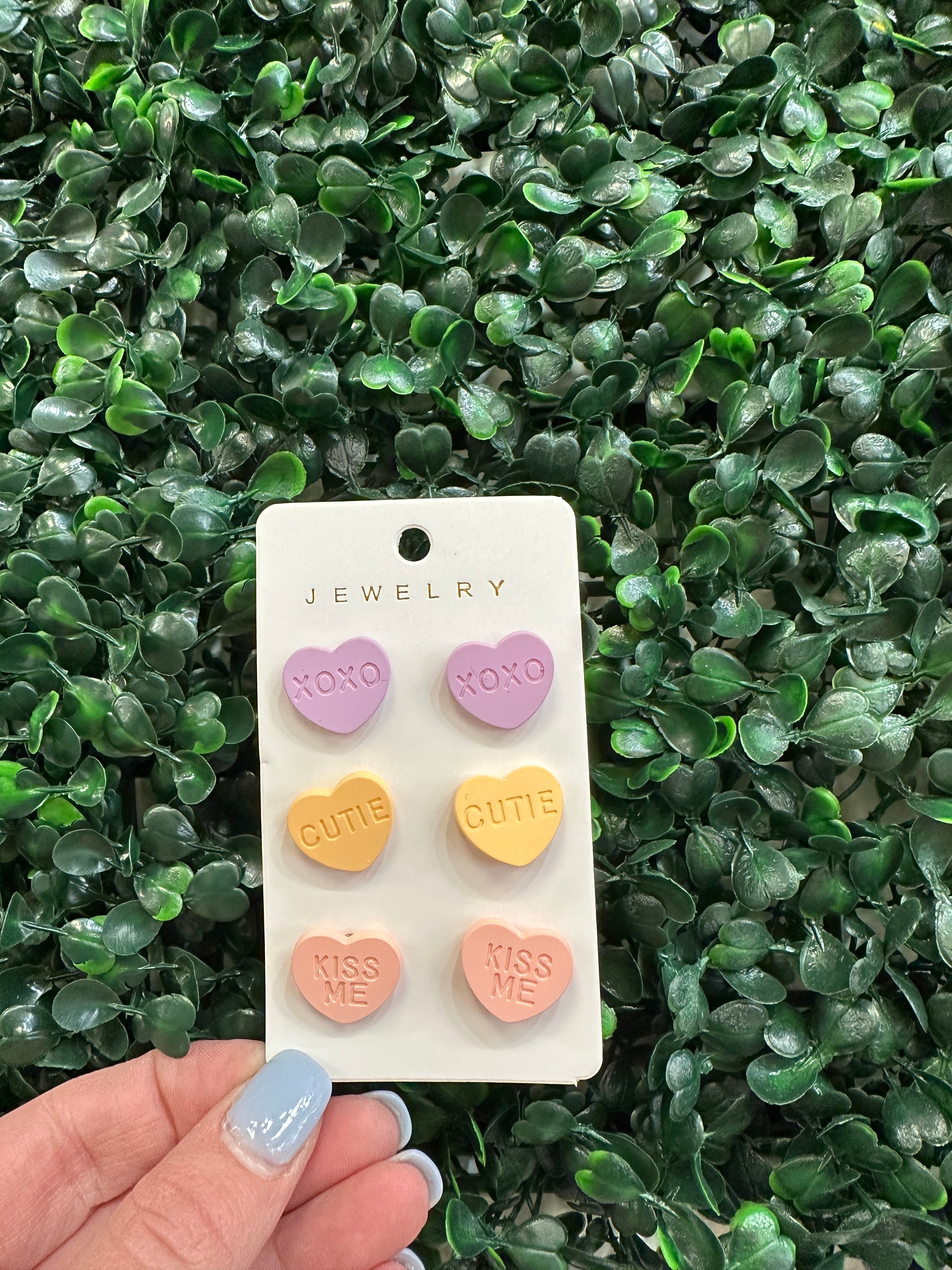 Candy heart stud earrings with 3 different valentine phrases