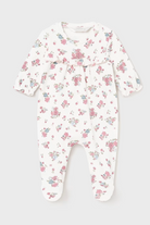 Baby girl footies in a white and pink floral print. Features snaps for easy diaper change and ruffle cuff sleeves