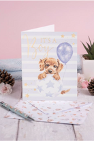 Celebrate the arrival of a baby boy with this gorgeous card featuring a little puppy. Printed on high quality, sustainably sourced textured board from responsibly managed forests. Inside reads 'Welcome baby boy'. Supplied with a printed envelope and measures 7 x 5 inches.