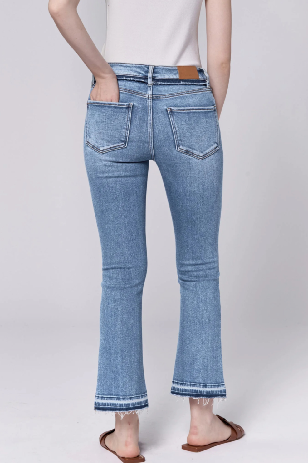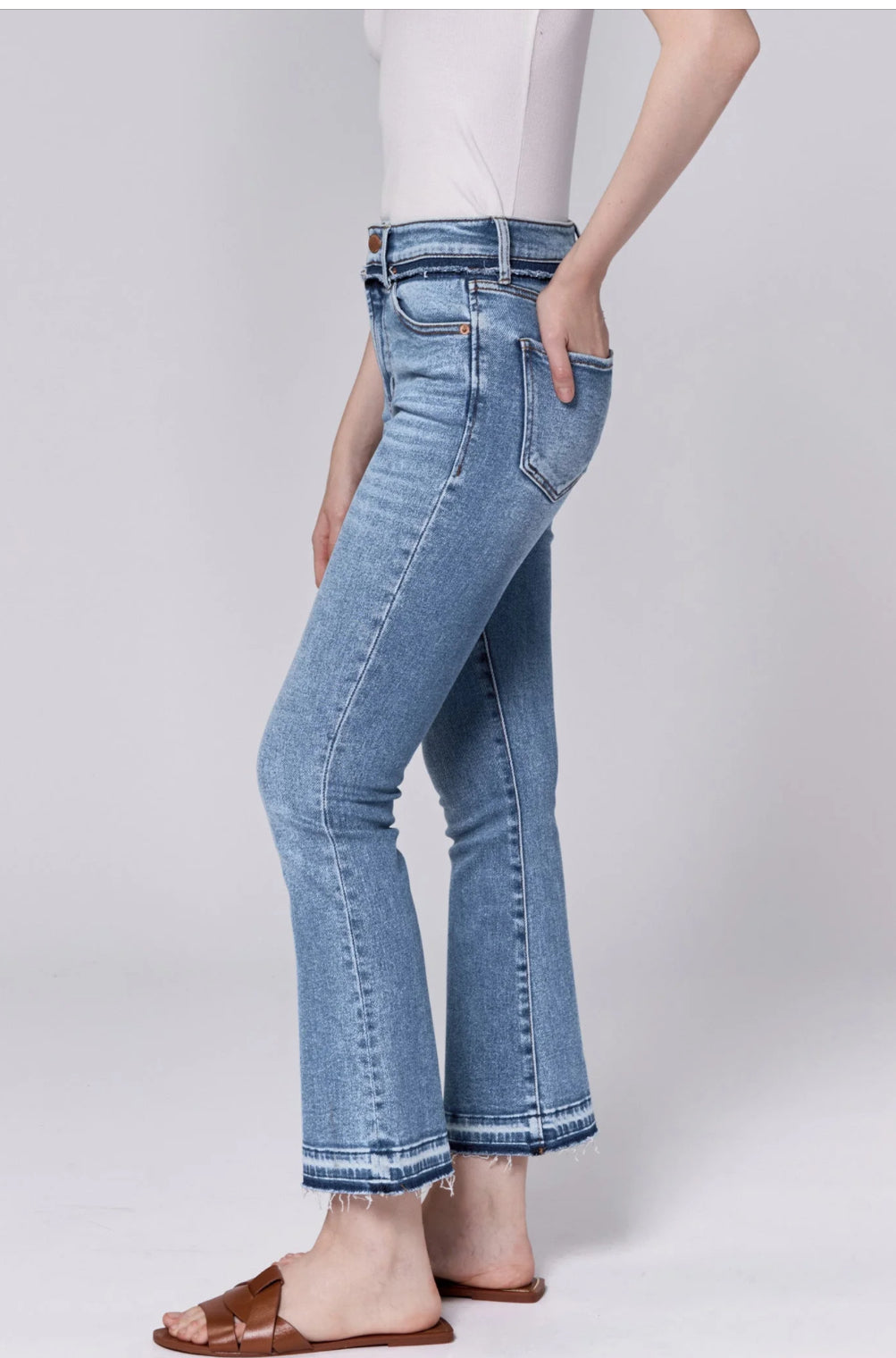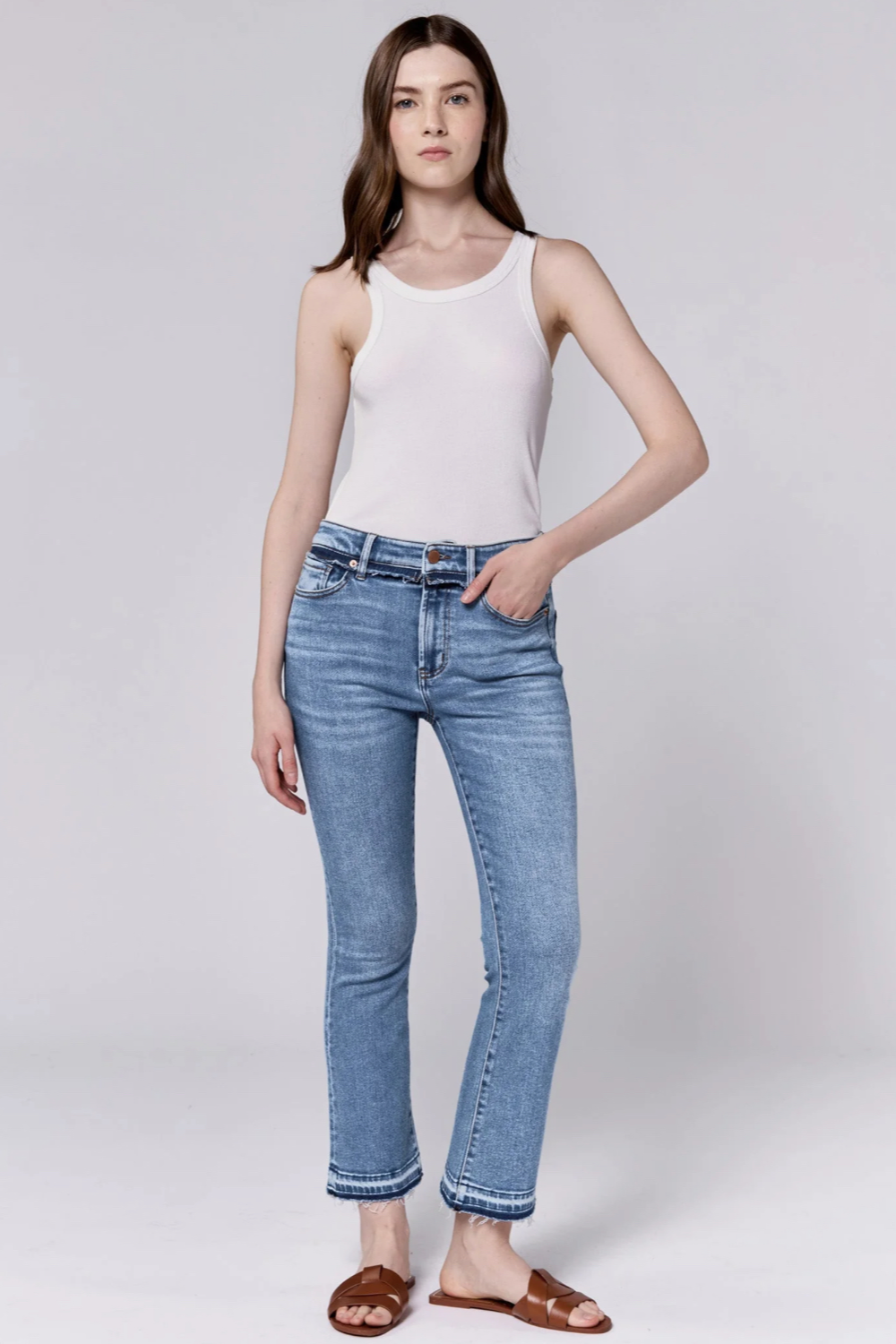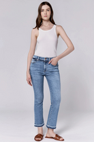Step into effortless elegance with these Jeanne mid rise tonal hem jeans in cropped inseam, a must-have of chic fashion. Designed with a flattering flare cut in stretch denim, these versatile outfits are perfect for every occasion, from workdays to weekends. The designer tonal denim washed hem & fray waistband showcases a fashion-forward look, creating the iconic ensemble for any wardrobe.
