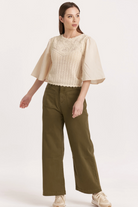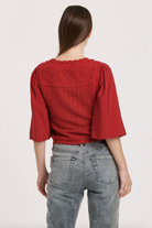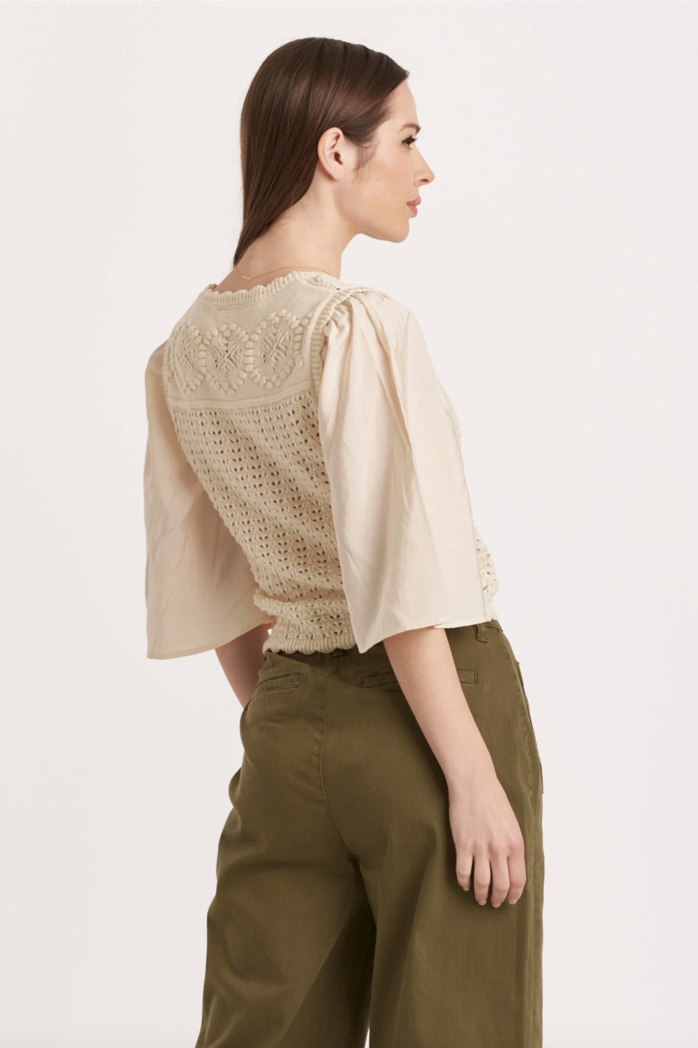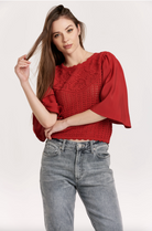 Wing sleeve sweater with scallop hem & armhole, floral crochet yoke & eyelets bodice finished with contrast mix media sleeve. Solid color yarn on standard fit. Love is in the air! Full expression of romantic patterns in lively palettes...