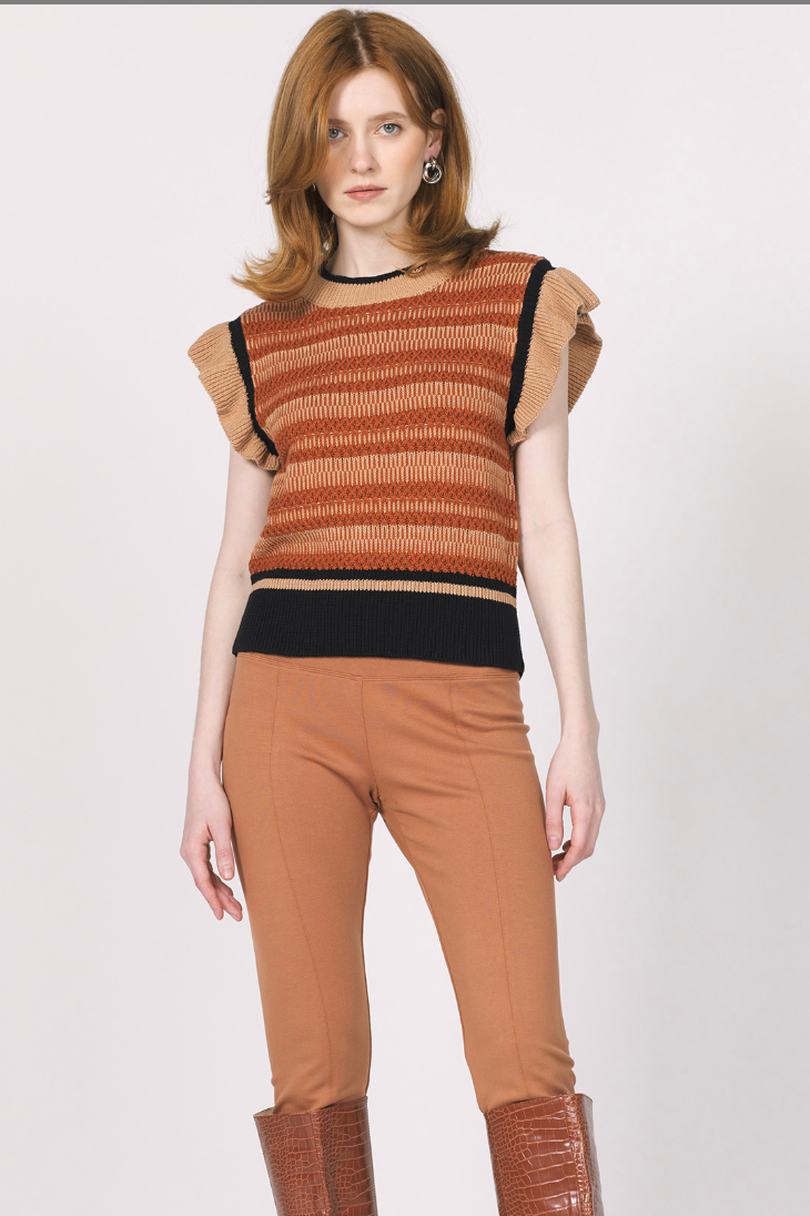 Pair your everyday style with the Kassandra crew neck ruffle detail sweater vest. It's perfect for layering, just the right touch of texture and flair. Crafted in a captivating seasonal hue that pairs effortlessly with your favorite tops, providing a cozy yet chic seamless blend of comfort and style.