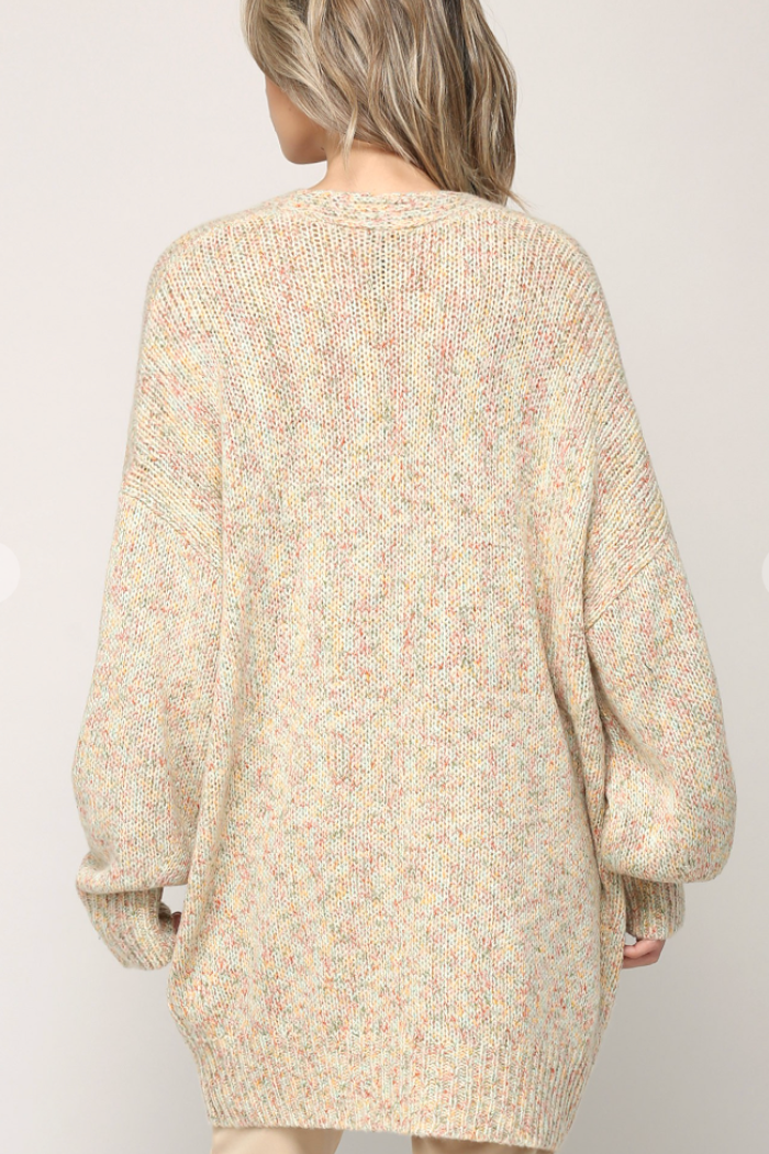 Features: wide long sleeve, ribbed hem, gorgeous blend knit colors, relaxed fit
