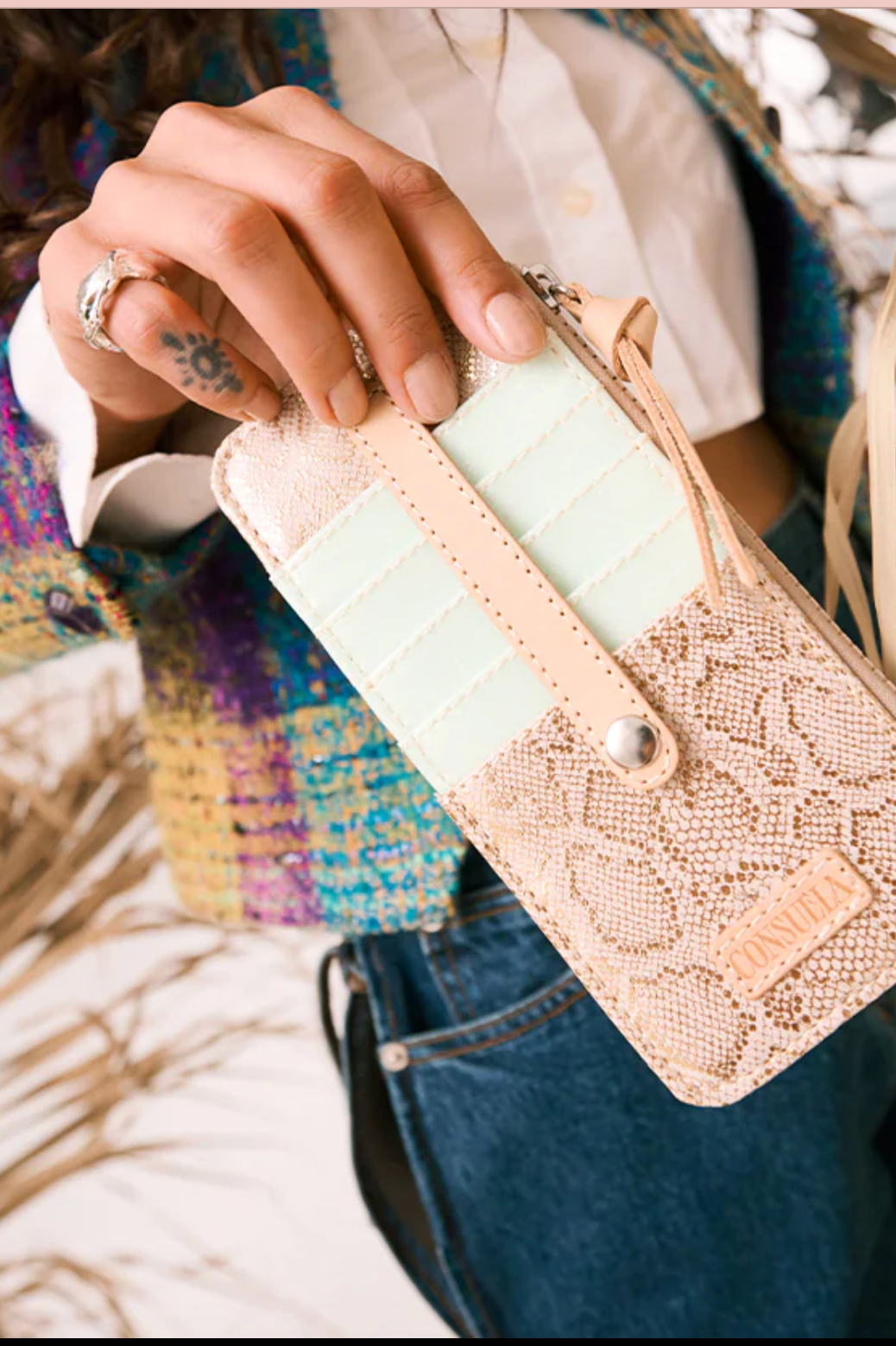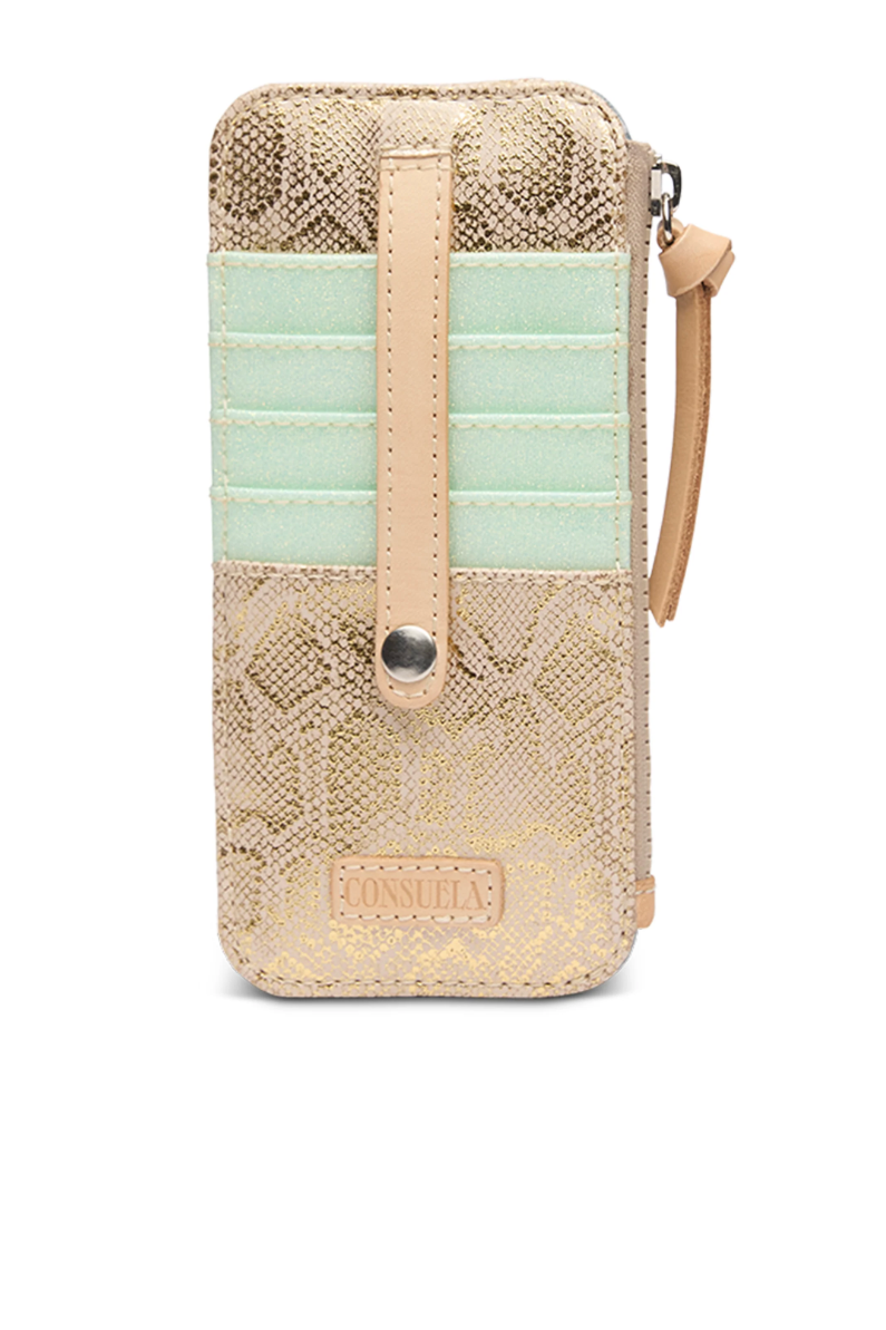 Keeping things light and easy, the card organizer is perfect for credit cards and folded bills. This metallic wallet’s snap-closure and zipper compartment provides security while you take on the day.
