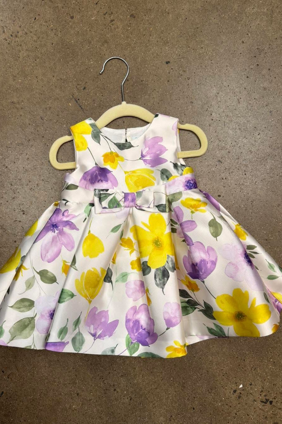 Girl floral mikado dress Abel & Lula.Spectacular mikado dress with a floral print from our special occasion collection for girls. All our garments are unique, made with premium fabrics, and designed in Spain with great care. The inner lining is cotton. Contains a semi crinoline to add volume to the skirt. Beautiful back opening with a covered button closure in the same fabric. Unique flower in the same fabric on the front. Invisible back zipper opening.