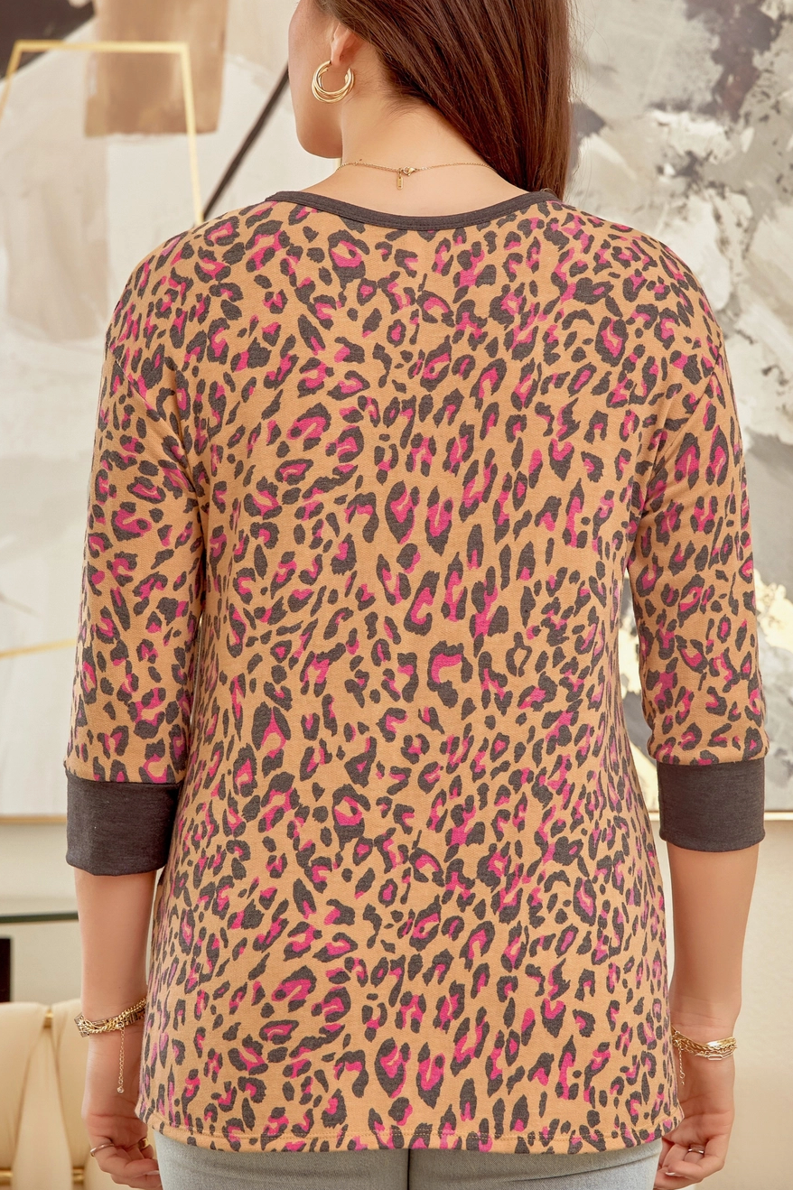 Cute printed top with contrasted panel on the neckline and sleeves. We love the relaxed fit on this top with 3/4" sleeves. Non sheer, knit, stretchy.