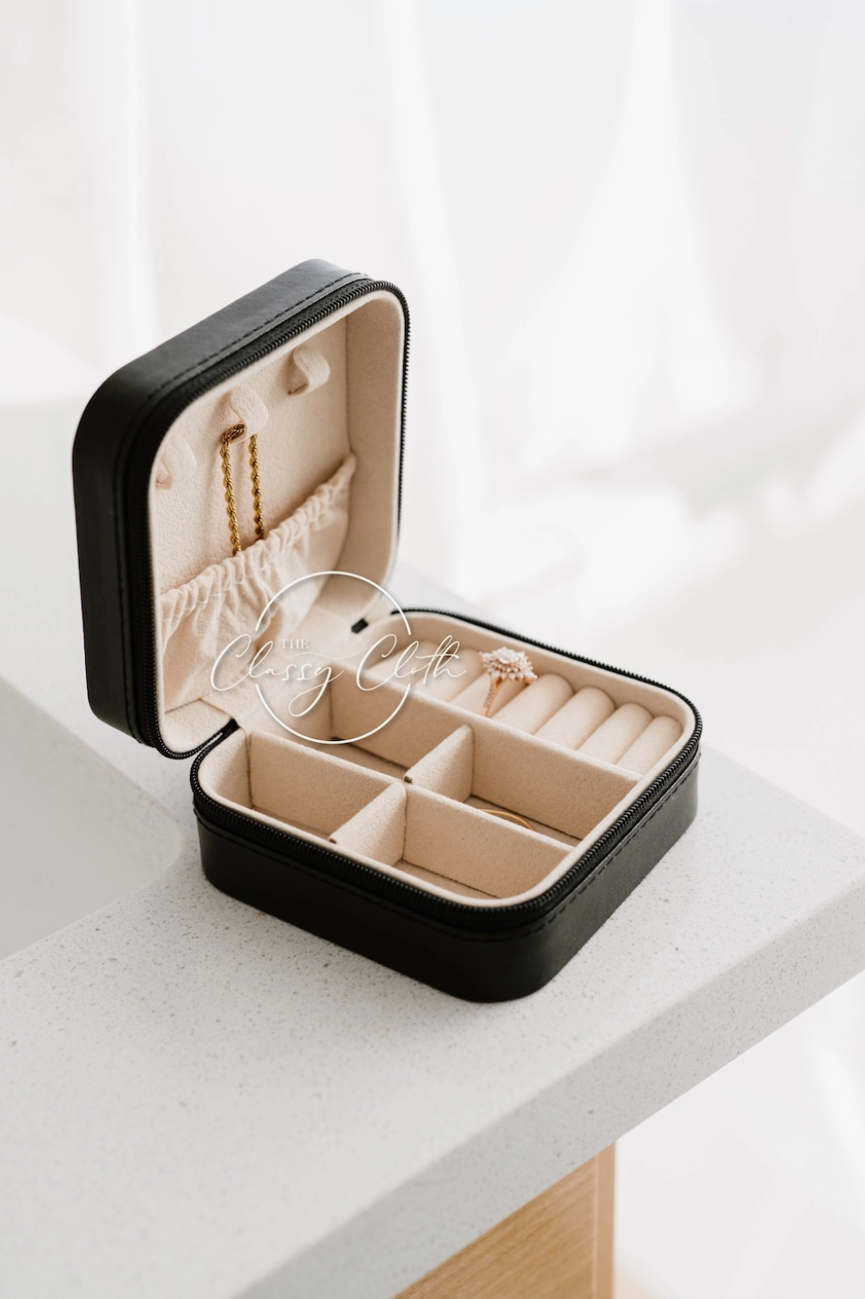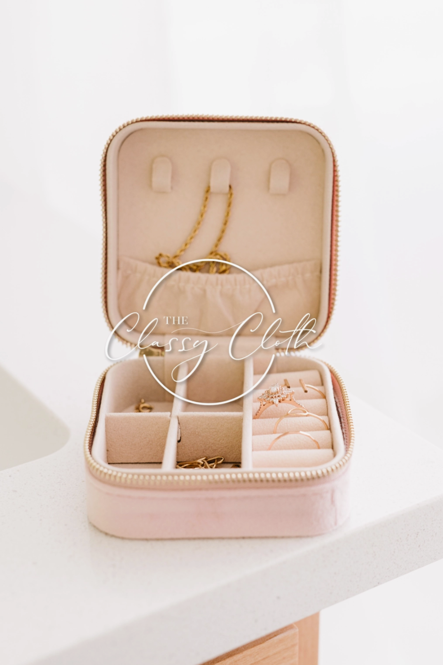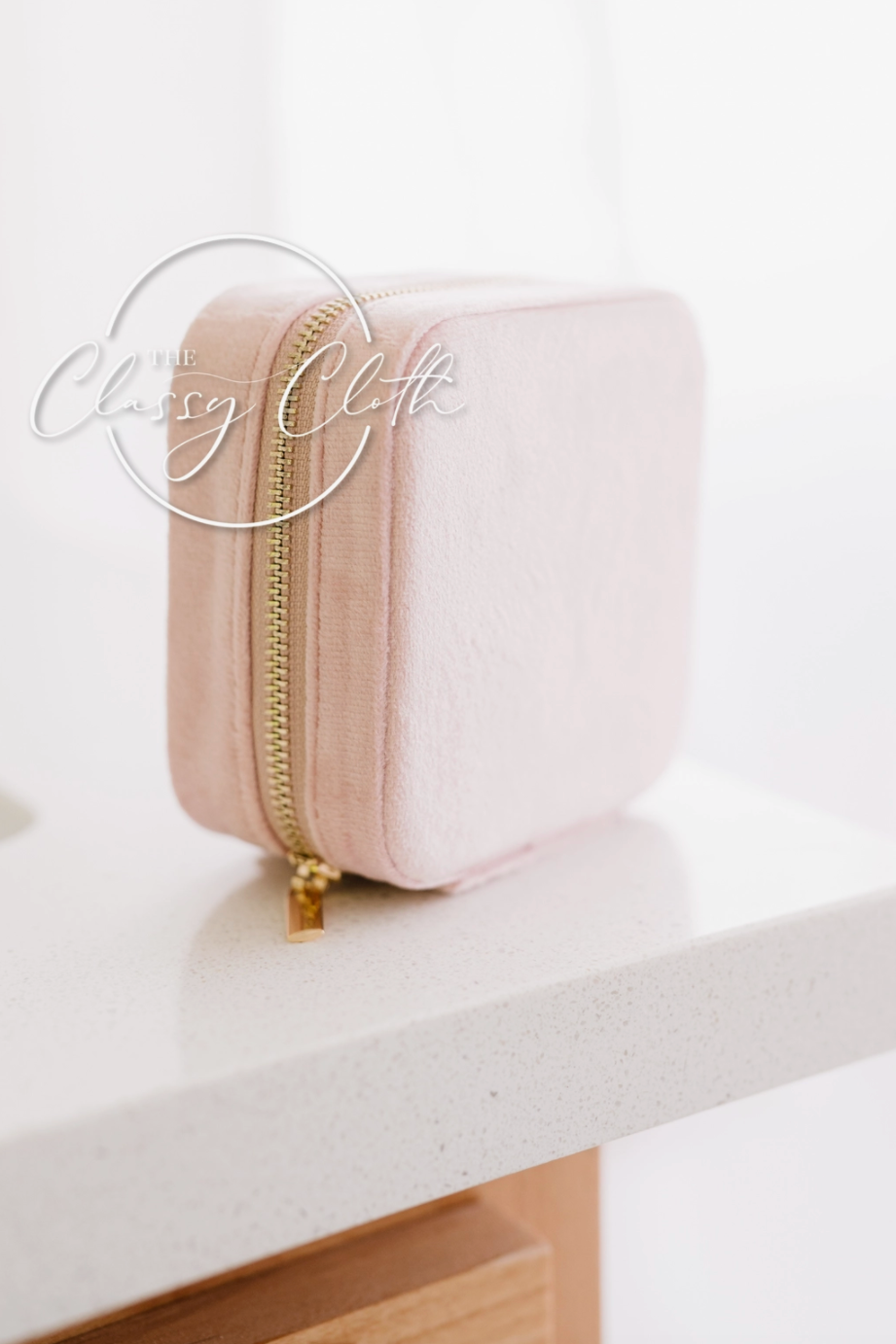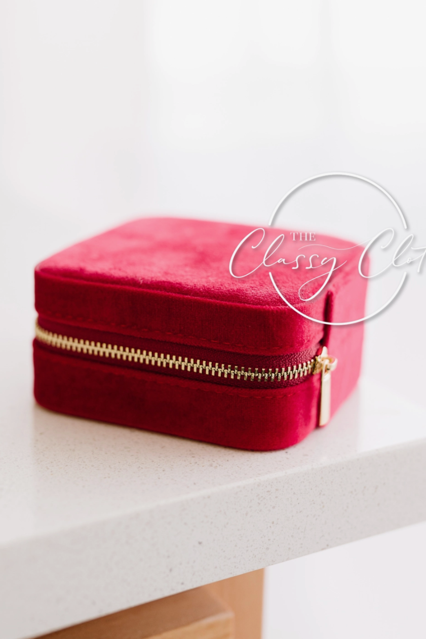Here's the perfect solution to jewelry organization on the go! Our Mini Jewelry Case is made of high quality velvet, with an internal pouch, necklace hooks, quad compartments, and ring & earring slots. All your jewelry is now ready for travel and totally organized.